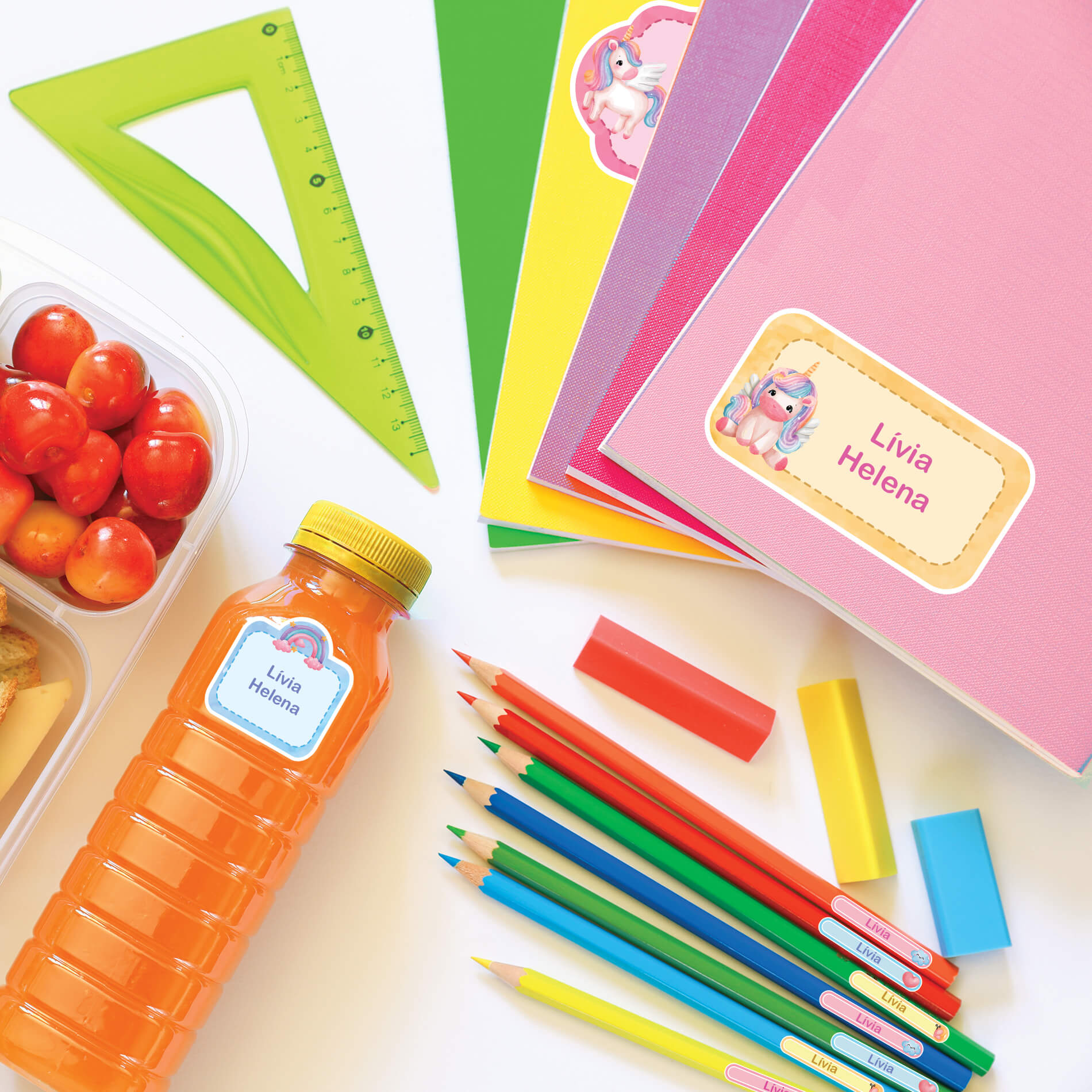 As etiquetas escolares são à prova d’água e podem ser coladas sem medo em objetos como copinhos, mamadeiras, estojos de escova de dentes, etc.