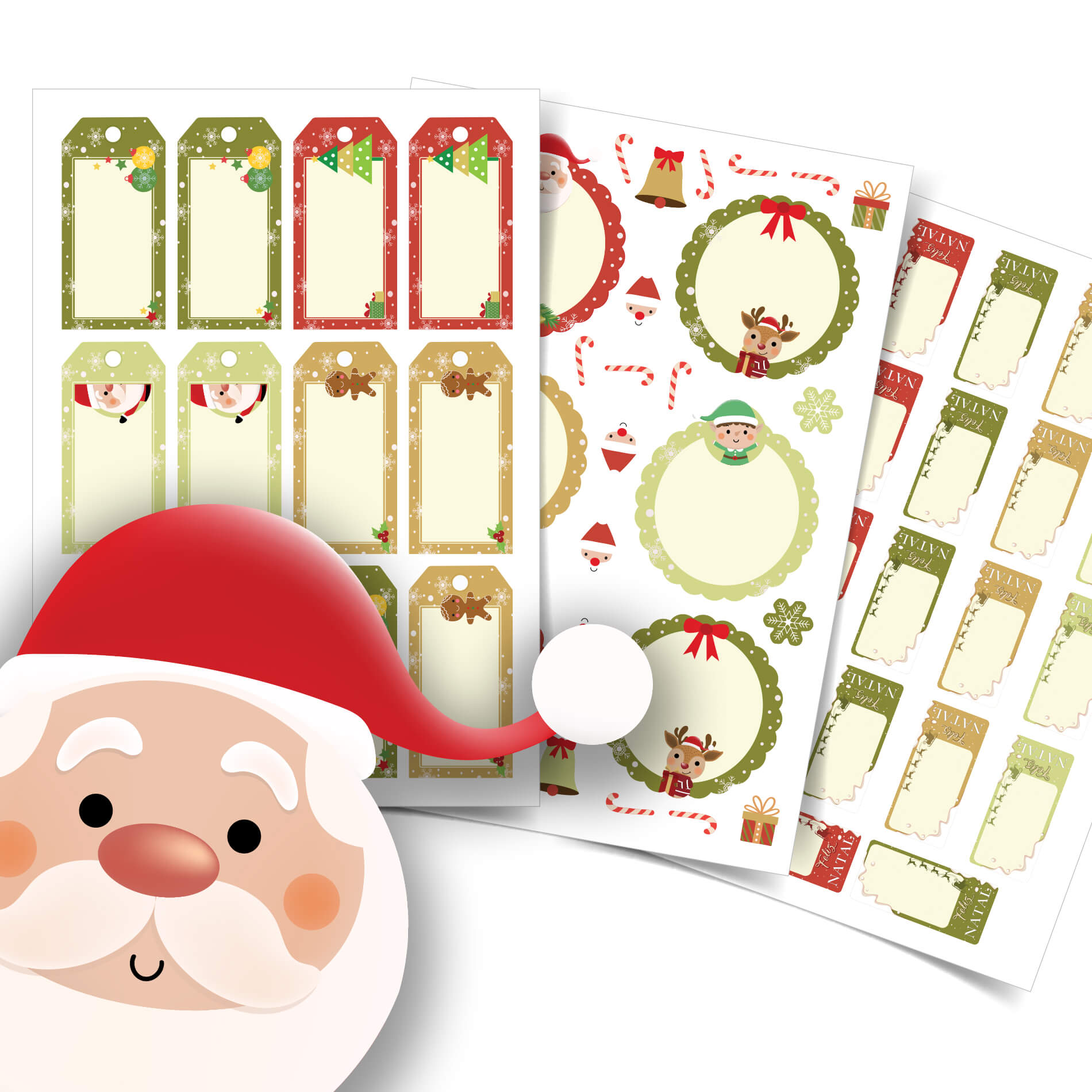 Folha com etiquetas natalinas em vários formatos e cores para personalização de presentes