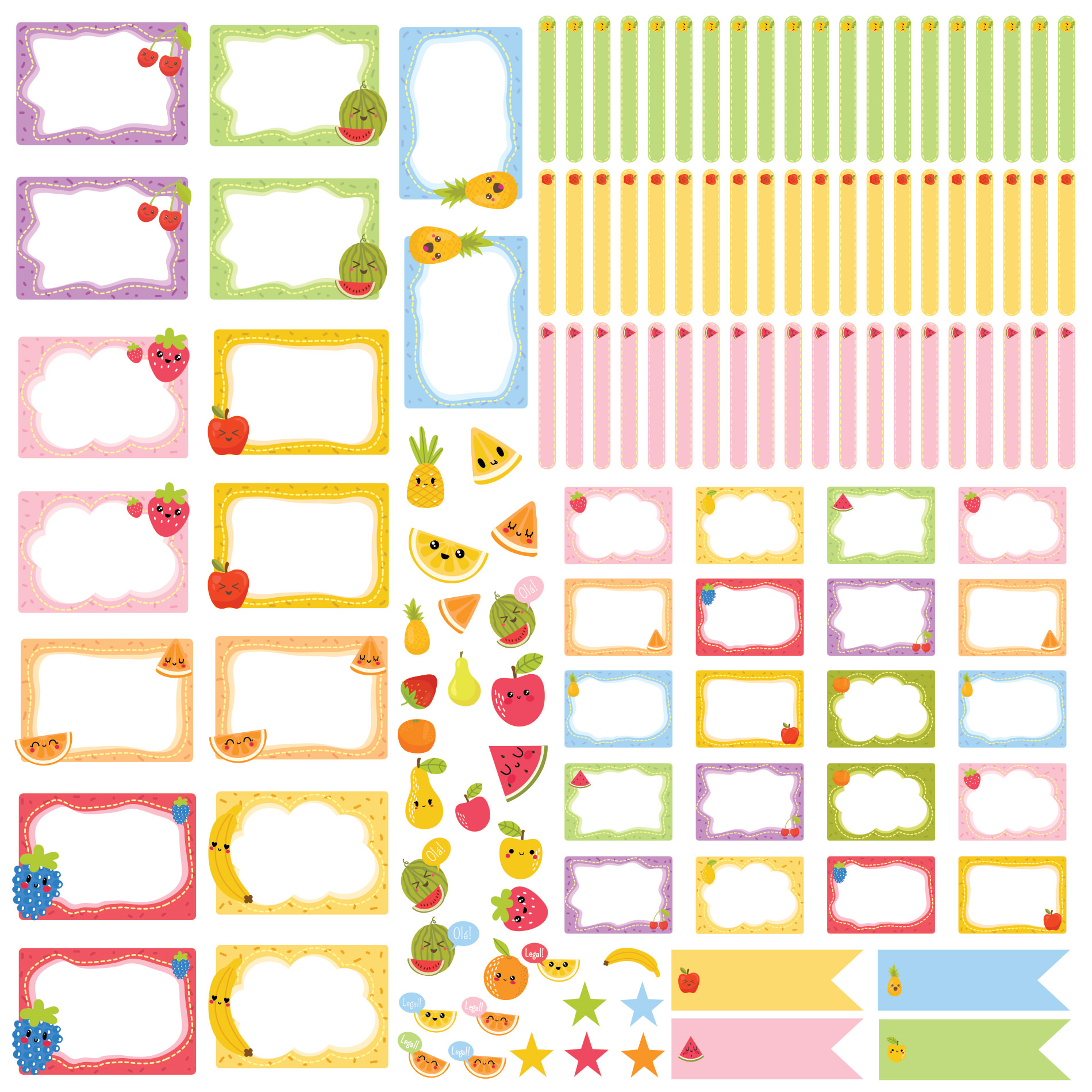 O kit de etiquetas escolares Salada de Frutas vem com 130 etiquetas escolares distribuídas em: