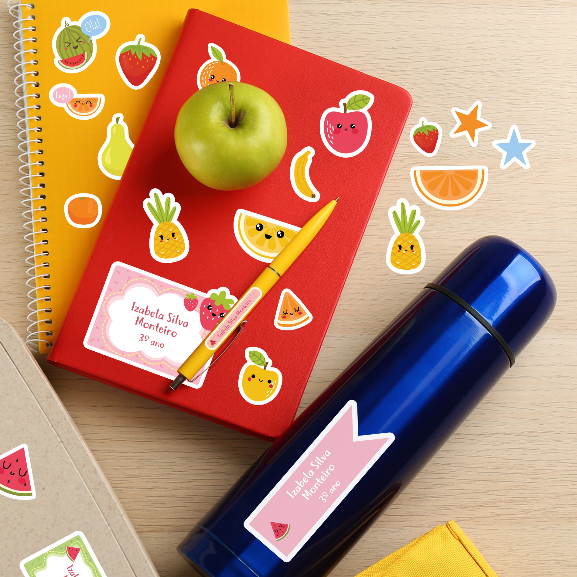 • Tipo de produto: Etiquetas escolares personalizadas em tema de frutas, com 130 peças para identificação de materiais.