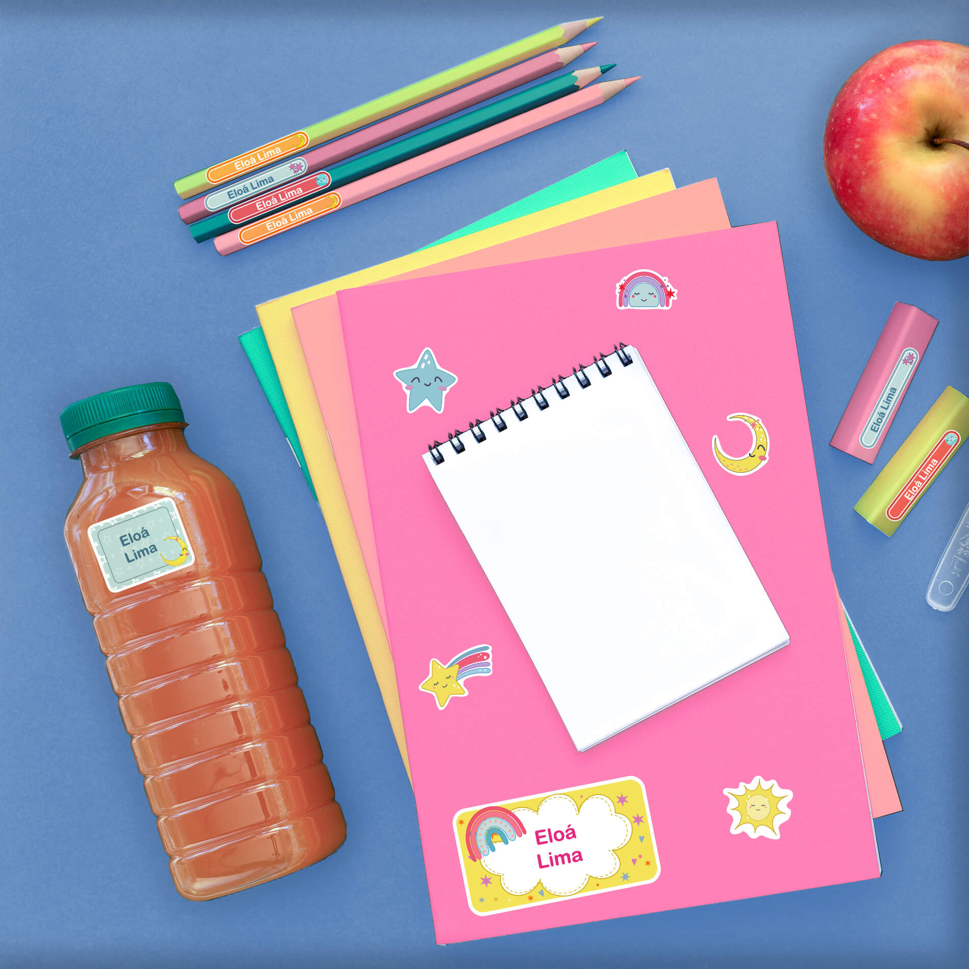 As etiquetas escolares são à prova d’água e podem ser coladas sem medo em objetos como copinhos, mamadeiras, estojos de escova de dentes, etc.