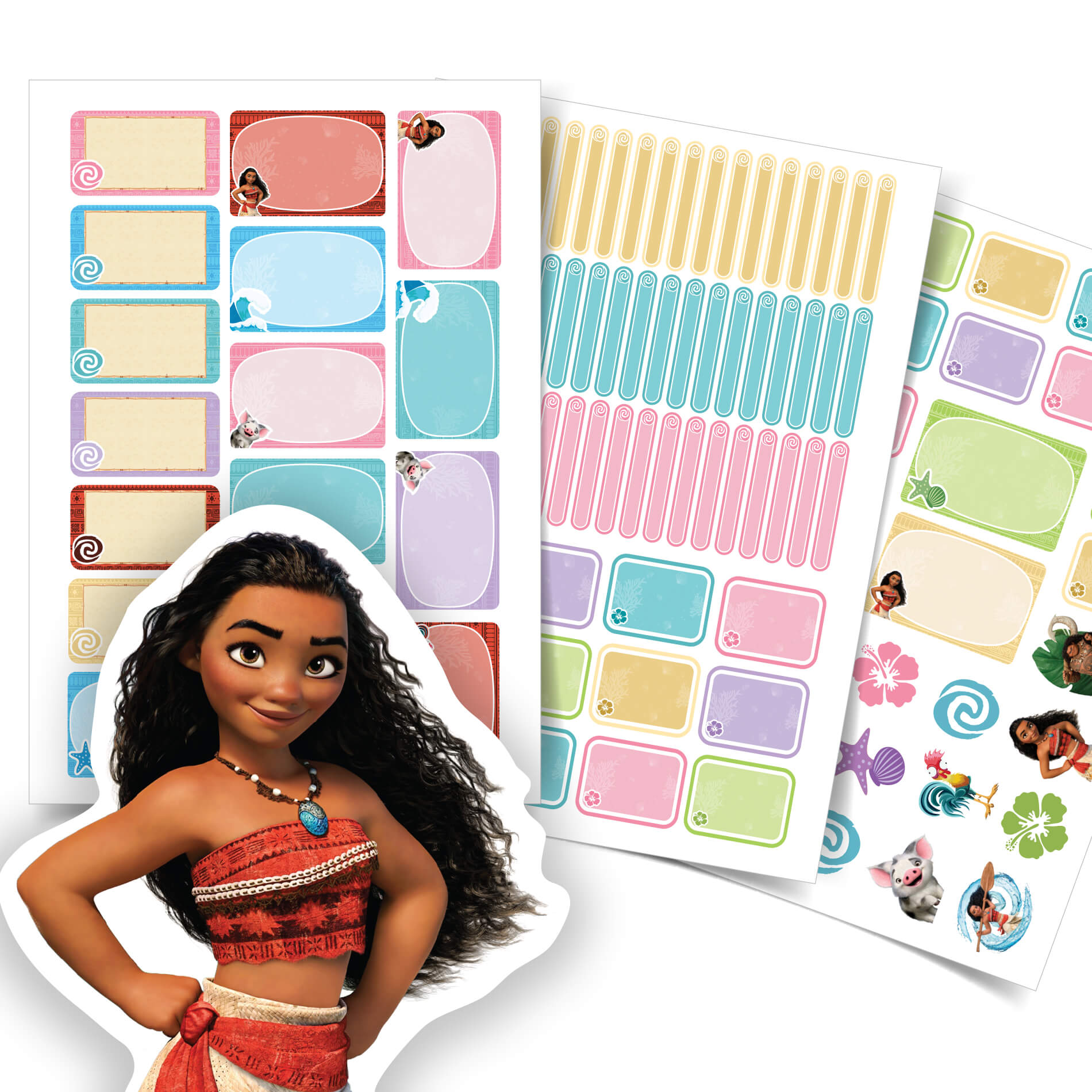 O kit de Etiquetas Escolares Moana vem com 109 Adesivos distribuídos em: