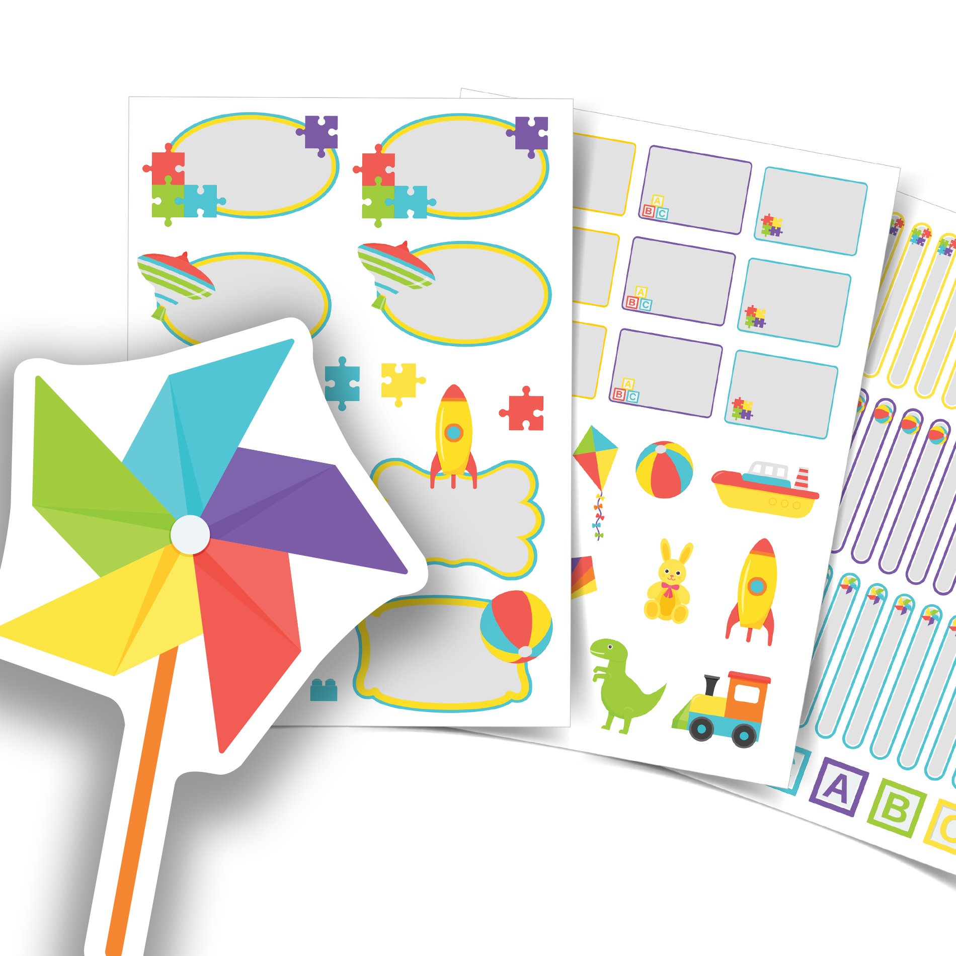 Além das etiquetas escolares, o kit vem com adesivos sortidos e divertidos para a criançada colar no caderno, na agenda, no estojo e brincar à vontade.
