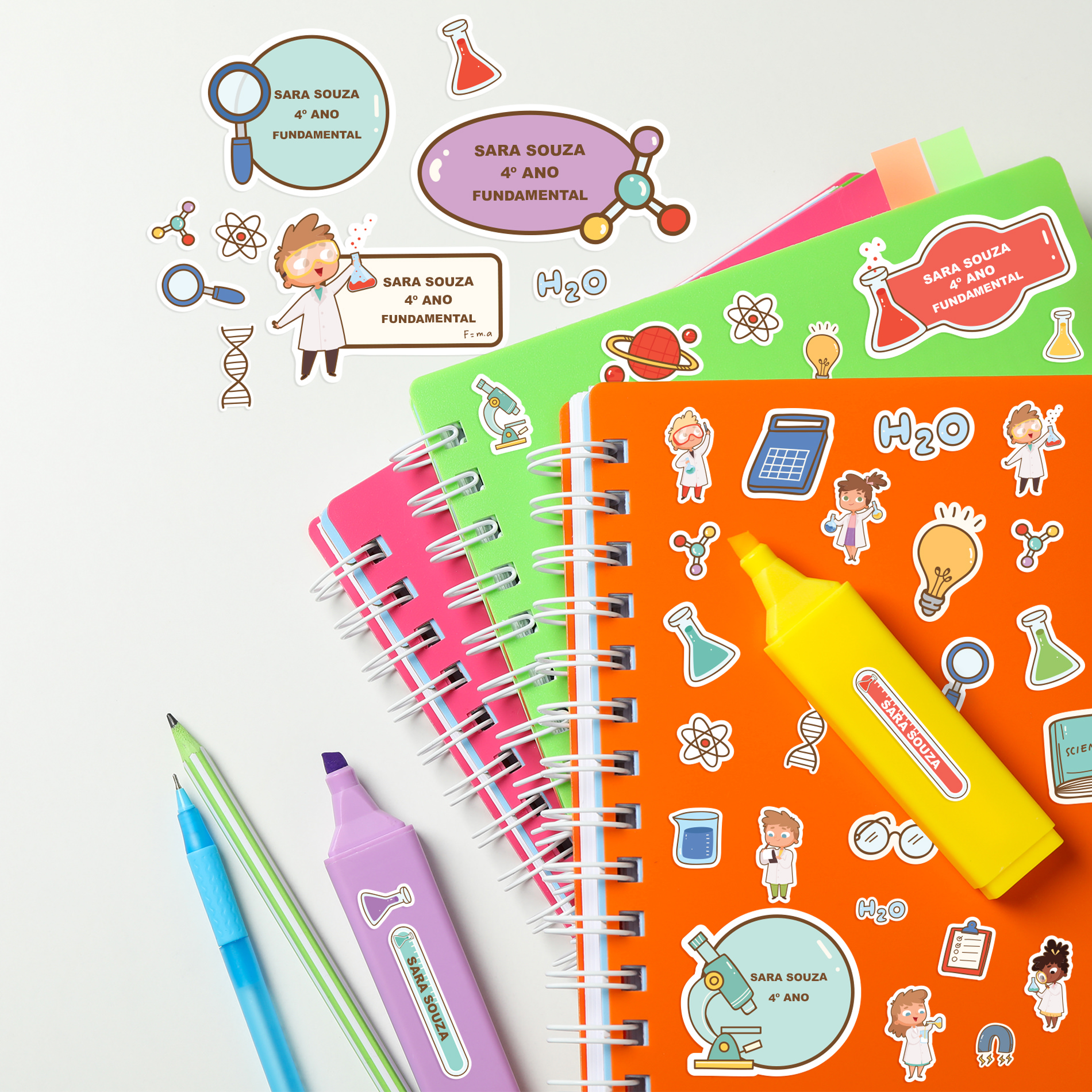 Transforme a mochila do seu filho em um acessório único e funcional com nossas etiquetas escolares personalizadas de Ciências! Faça seu pedido agora e dê um toque especial aos pertences escolares do seu pequeno cientista.