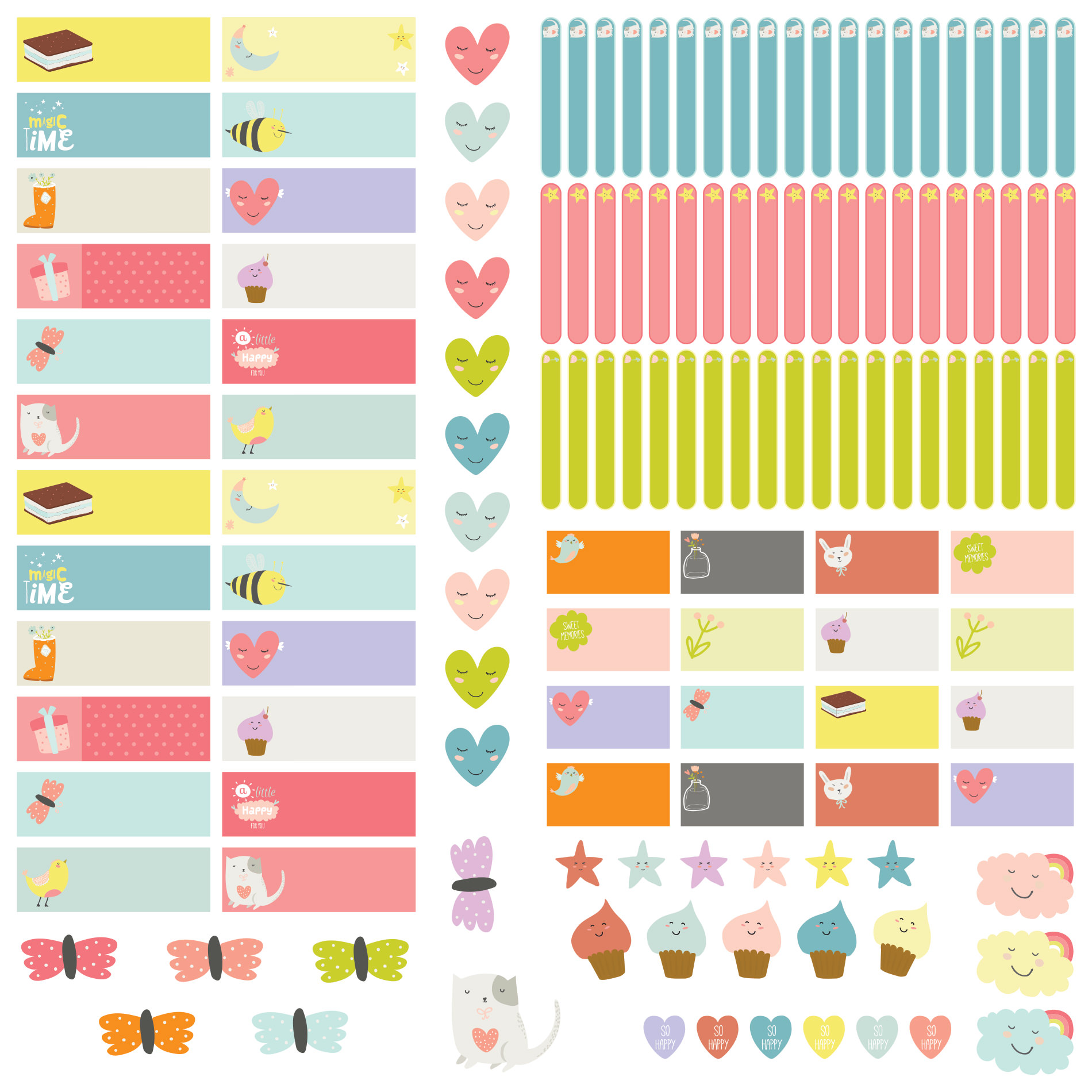 Além das etiquetas escolares, o kit vem com adesivos sortidos e divertidos para a criançada colar no caderno, na agenda, no estojo e brincar à vontade.