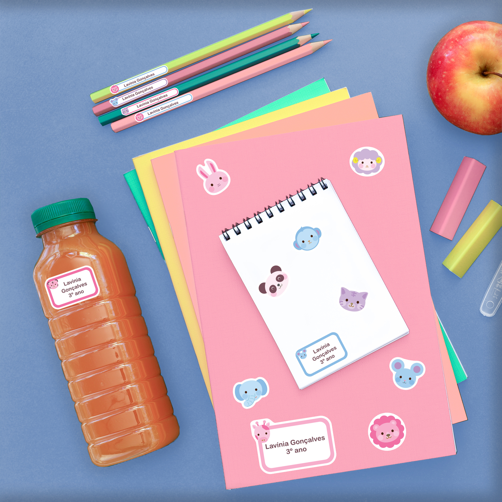 O kit de Etiquetas Escolares Safari Rosa vem com 114 Adesivos distribuídos em: