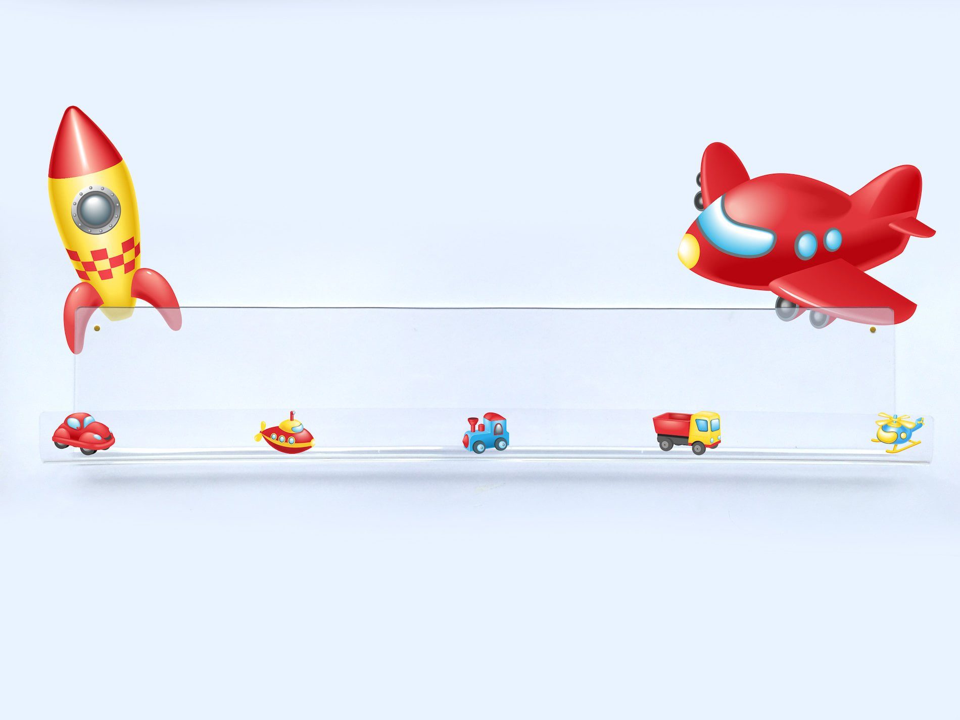 2 Adesivos maiores (Avião e Foguete) e 5 adesivos menores (carro, caminhão, helicóptero, submarino e tren)
