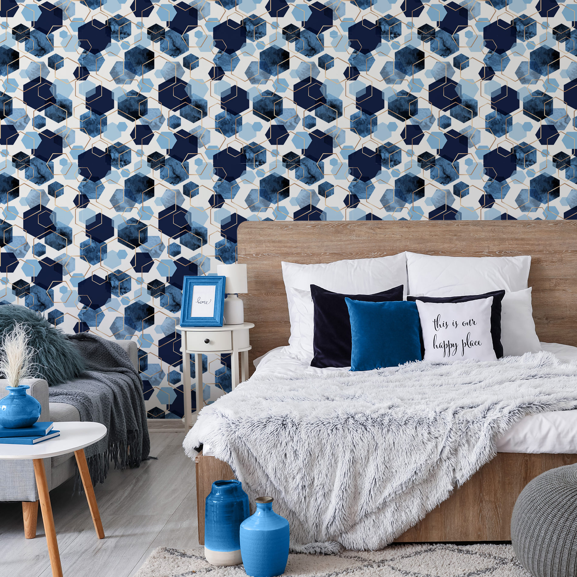 O padrão colméia em tons de azul e dourado confere um toque contemporâneo e luxuoso ao seu espaço. A paleta de cores cuidadosamente selecionada cria uma atmosfera sofisticada, enquanto o design geométrico em colmeia adiciona textura e profundidade à sua parede.