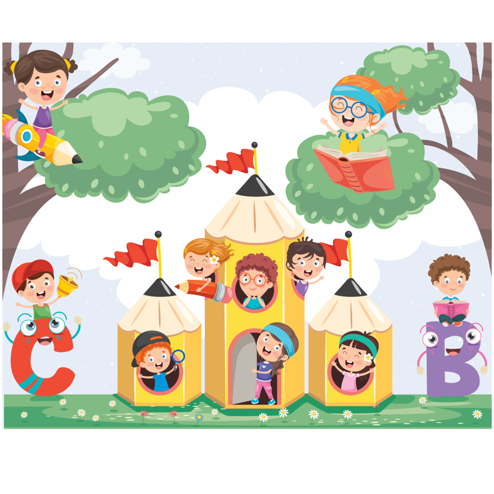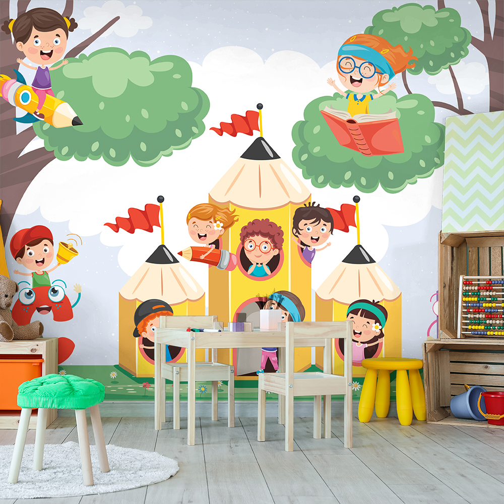 Papel de Parede Infantil Crianças Castelo Lápis Aprender 9m²