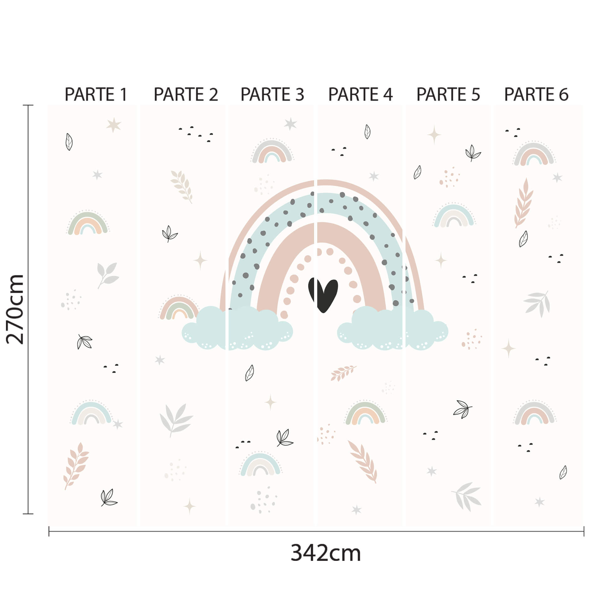 Imagem técnica do papel de parede infantil com medidas e divisão em 6 partes verticais