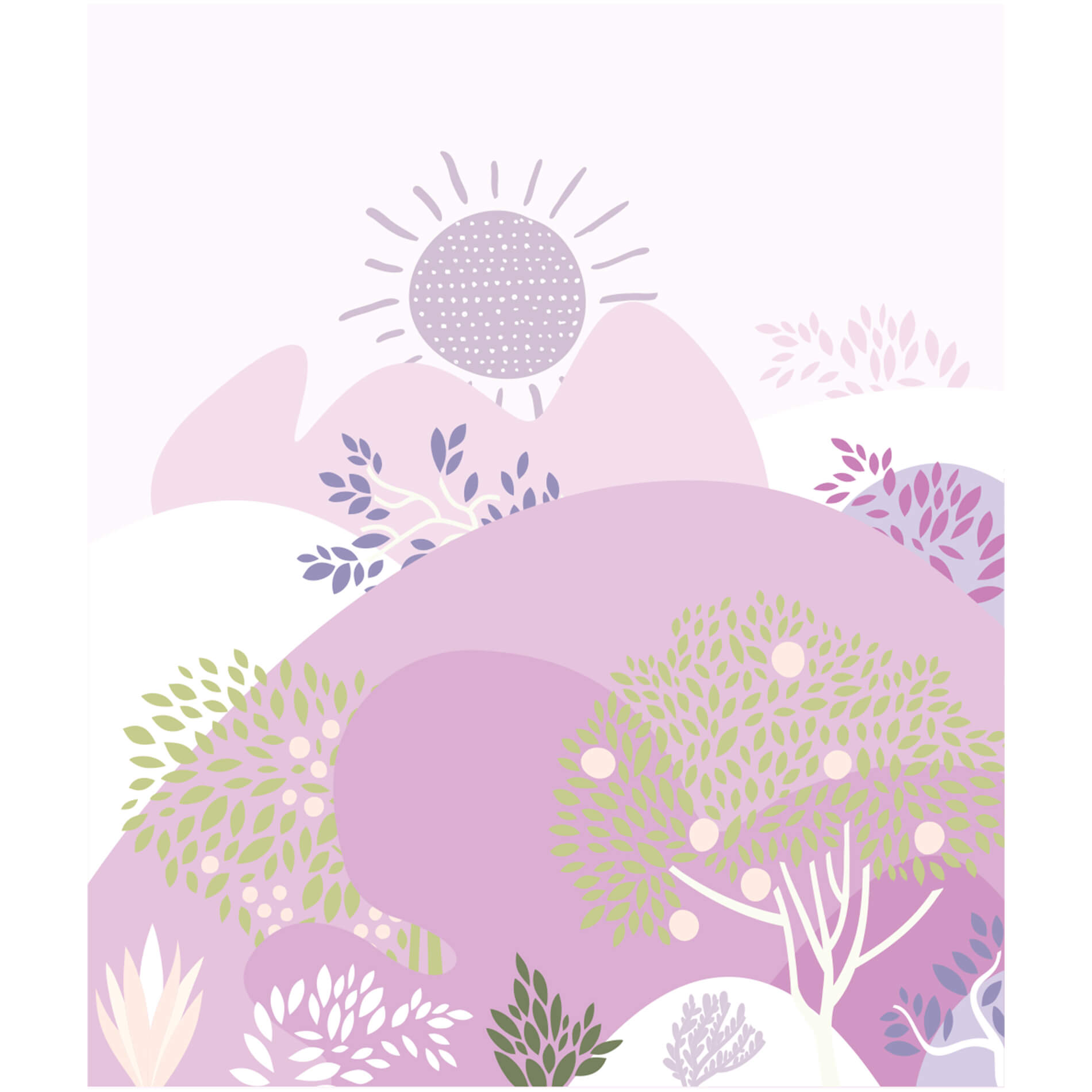 • Design lúdico: Apresenta ilustrações de árvores em tons lilás, perfeito para a decoração do quarto de meninas.