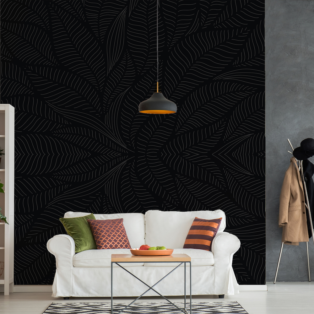 Imagem mostrando faixas do papel de parede preto com padrão botânico para aplicação