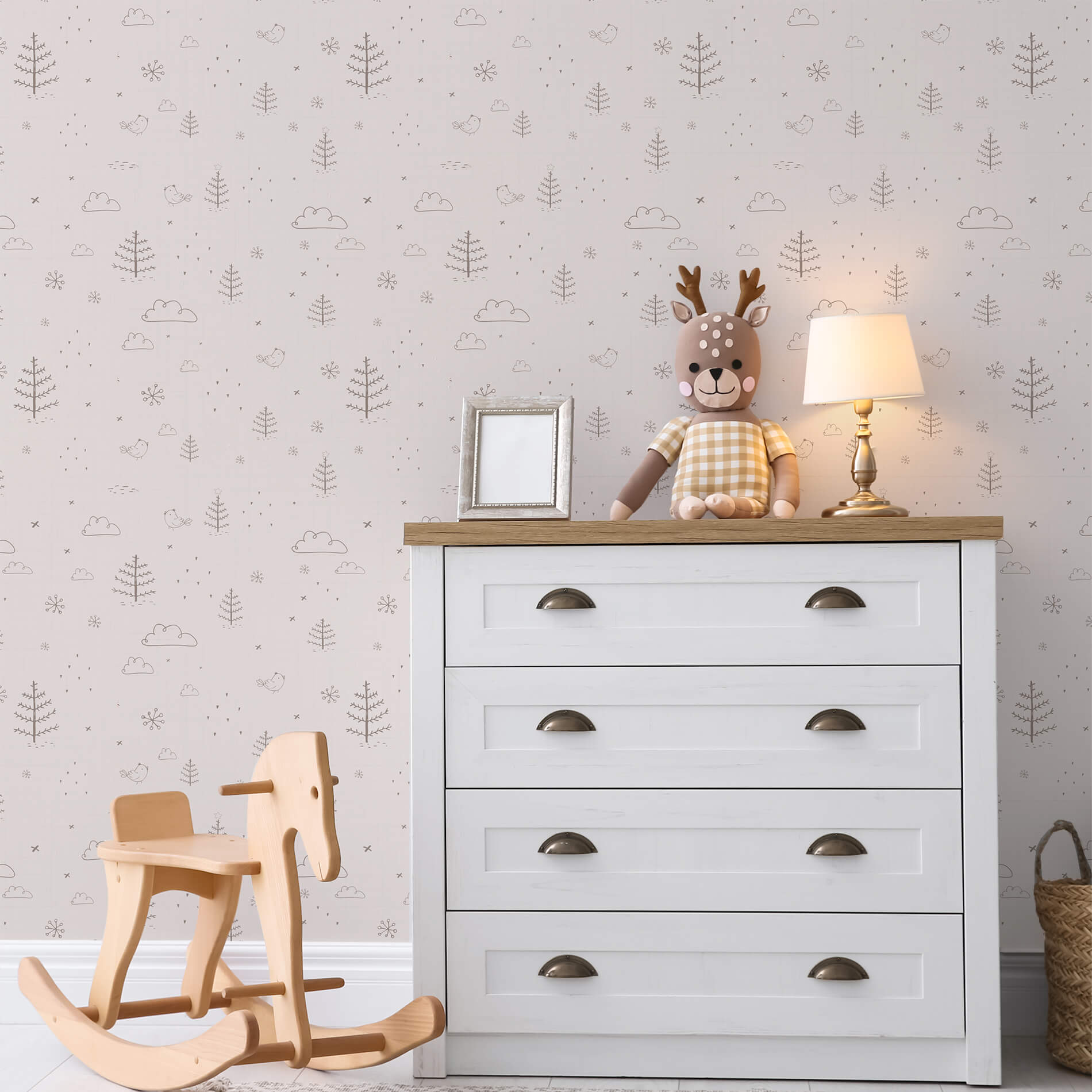 Imagem detalhada do papel de parede infantil com padrão de árvores e nuvens, mostrando textura e acabamento fosco.