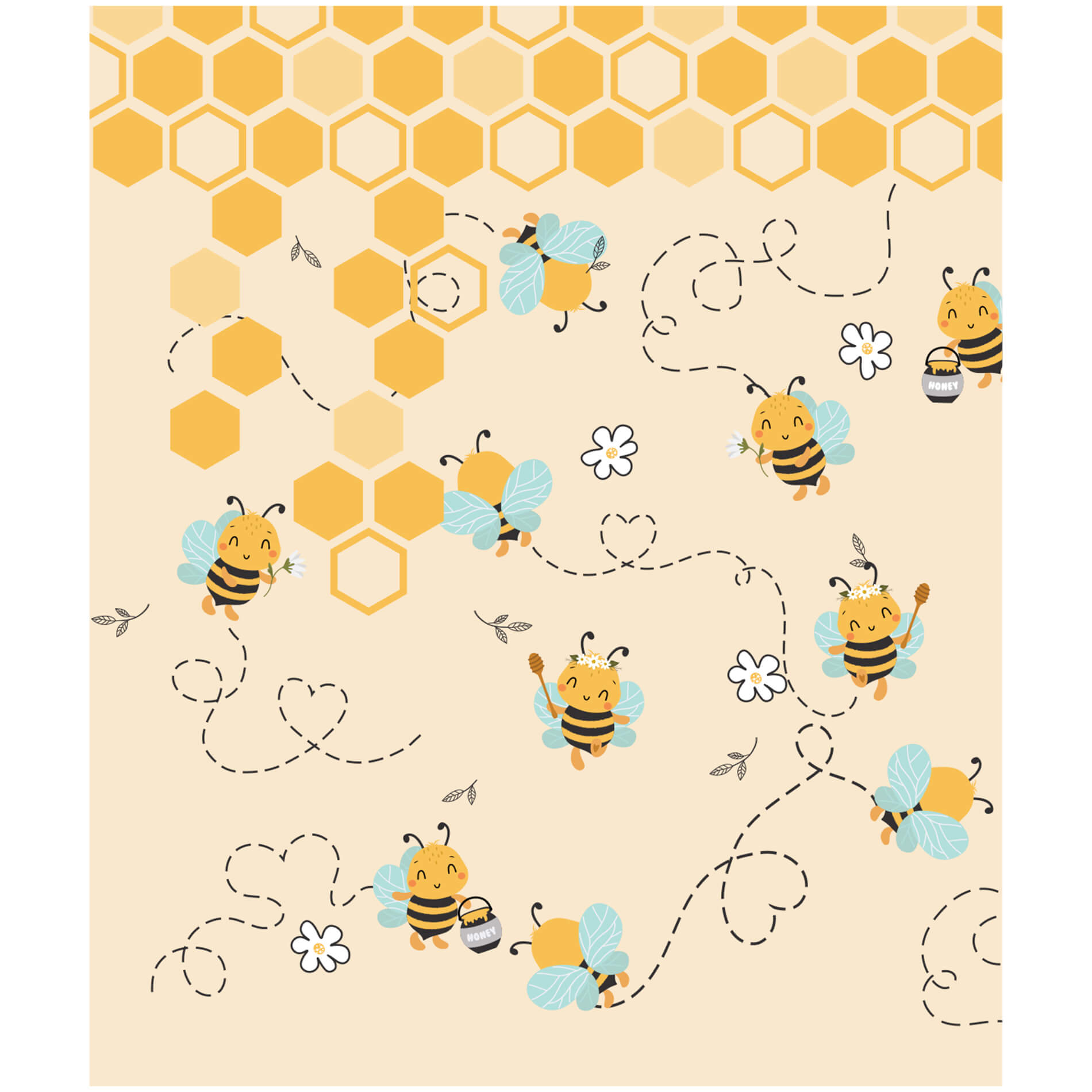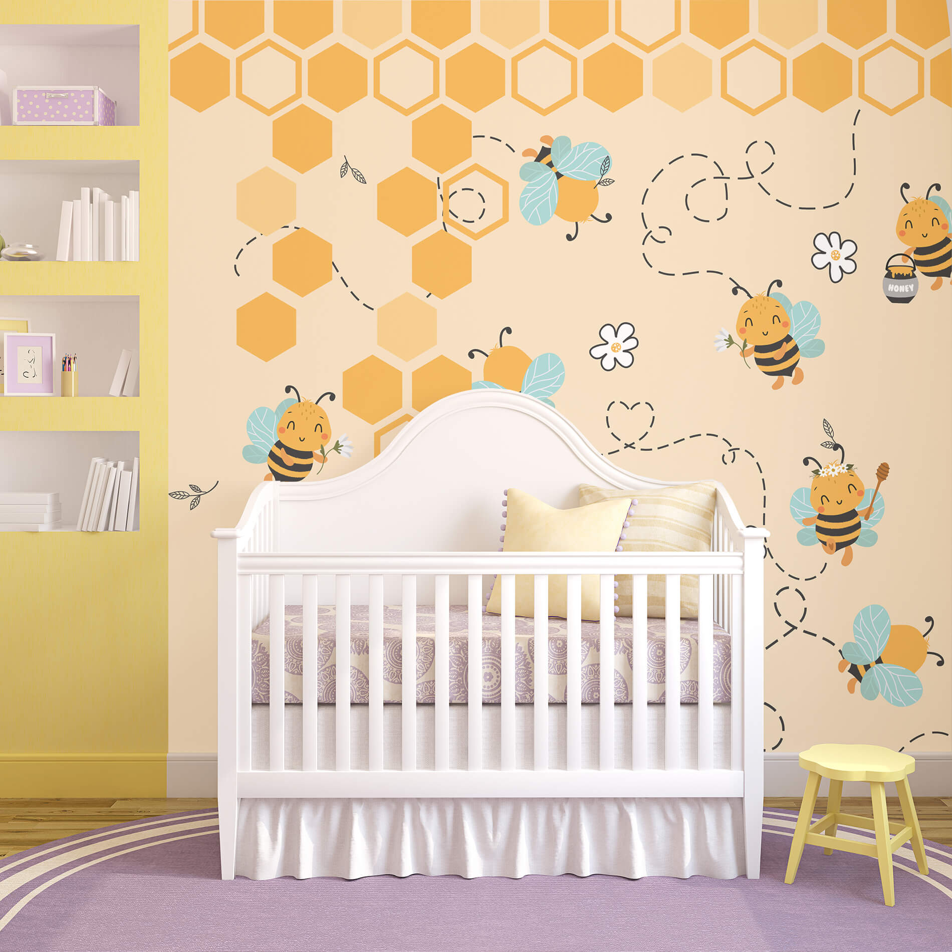 - Design lúdico com tema de abelhas e mel ideal para quartos infantis.