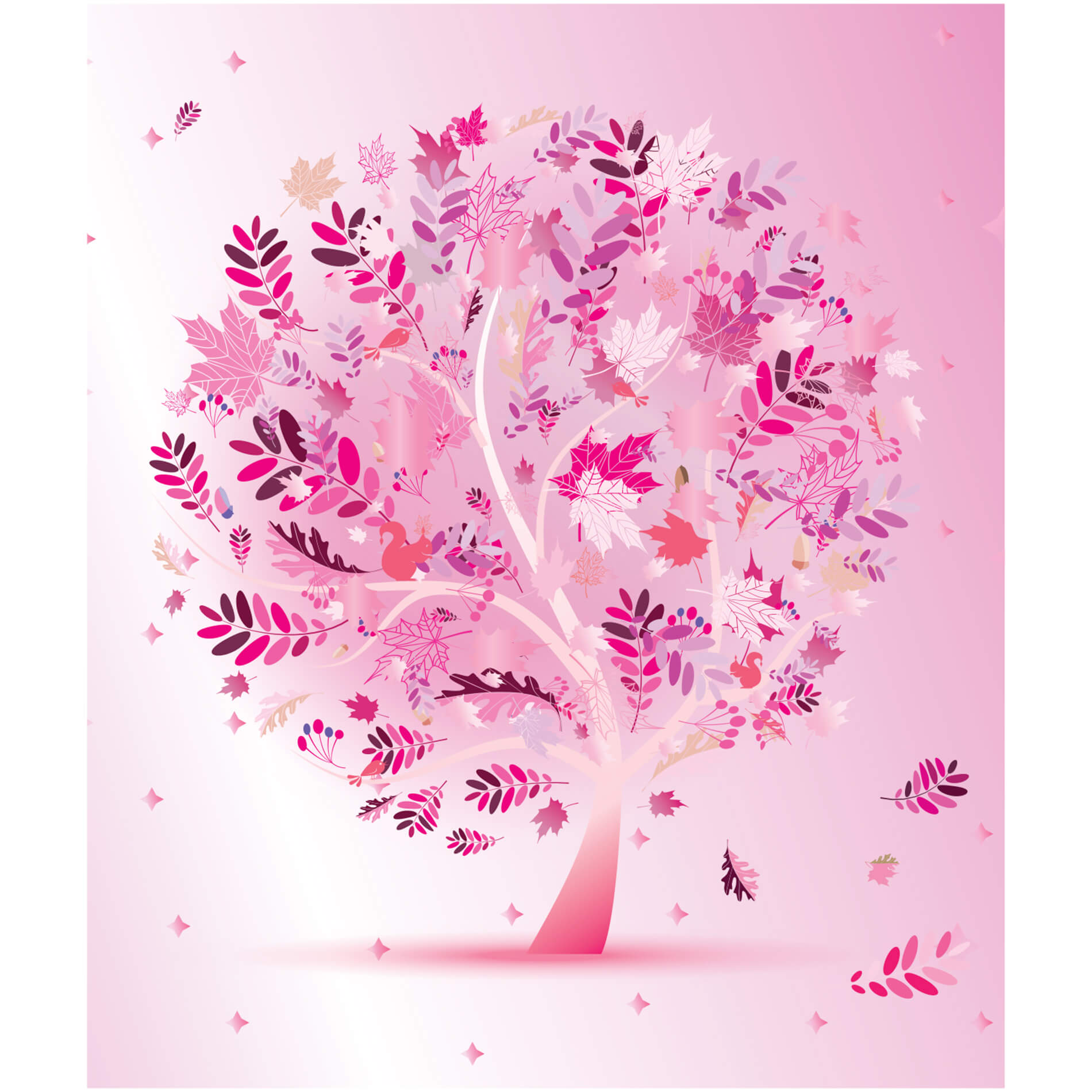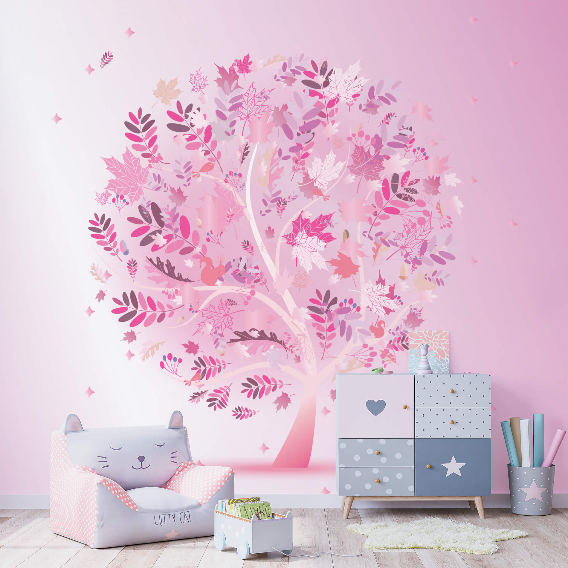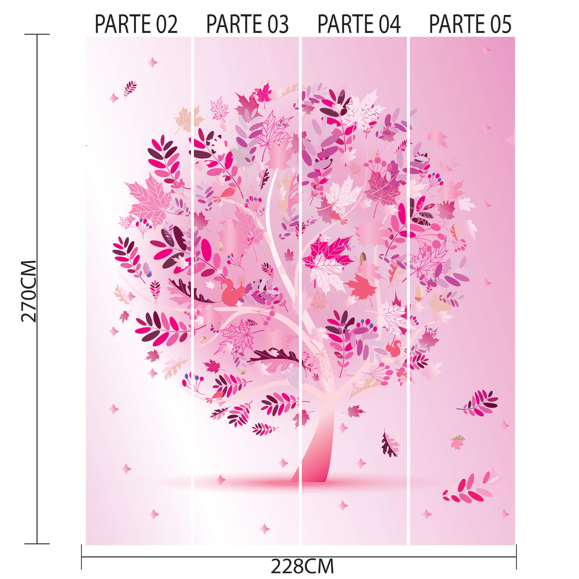 Papel de Parede Quarto Menina Árvore Folhas Rosa Painel 6m²
