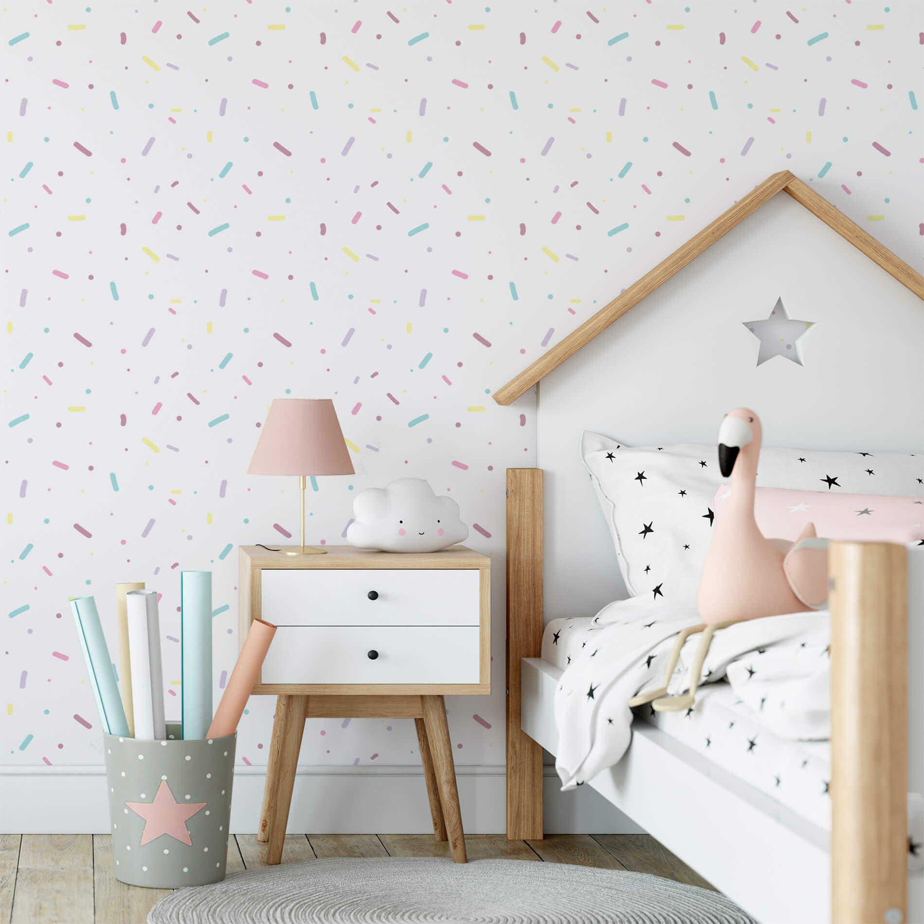 • Tipo de produto: Papel de parede adesivo com estampa de confete colorido, ideal para quartos infantis.