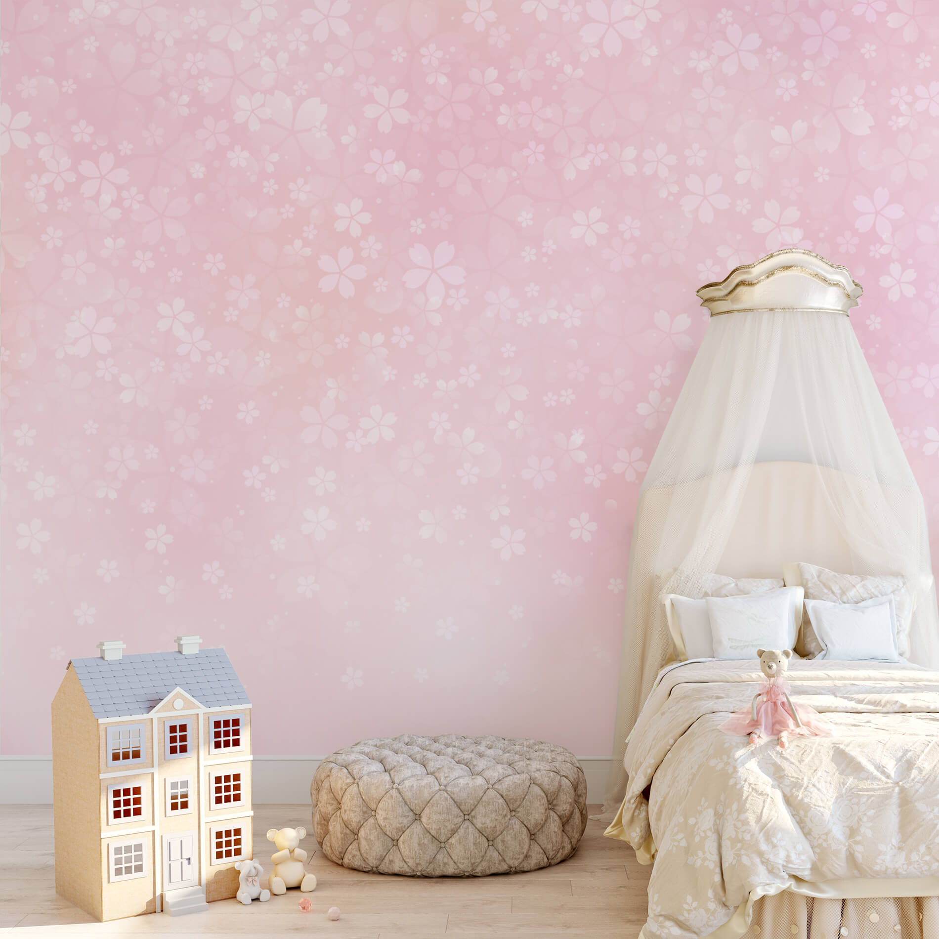 • Design lúdico: Padrão aquarelado com flores de cerejeira em tons de rosa, ideal para quartos infantis.