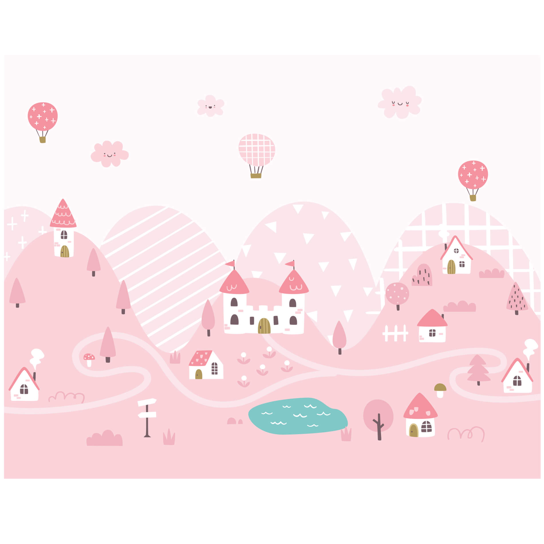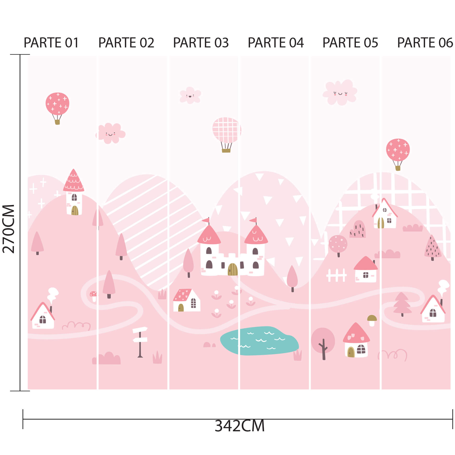 Papel de Parede Quarto Menina Vila Encantada Rosa Painel 9m²