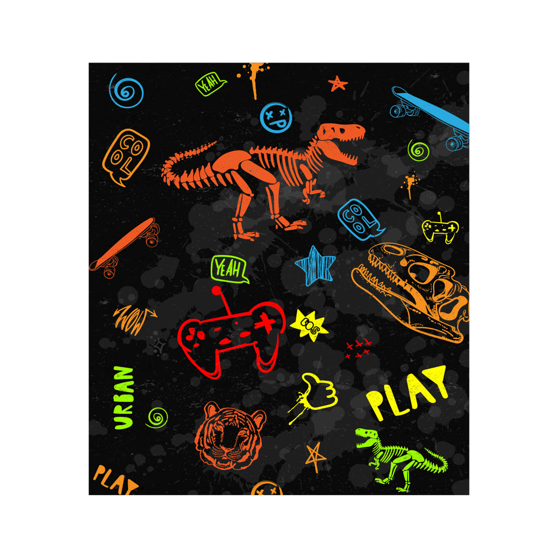 - Design lúdico e colorido com tema dinossauro gamer que decora e diverte.