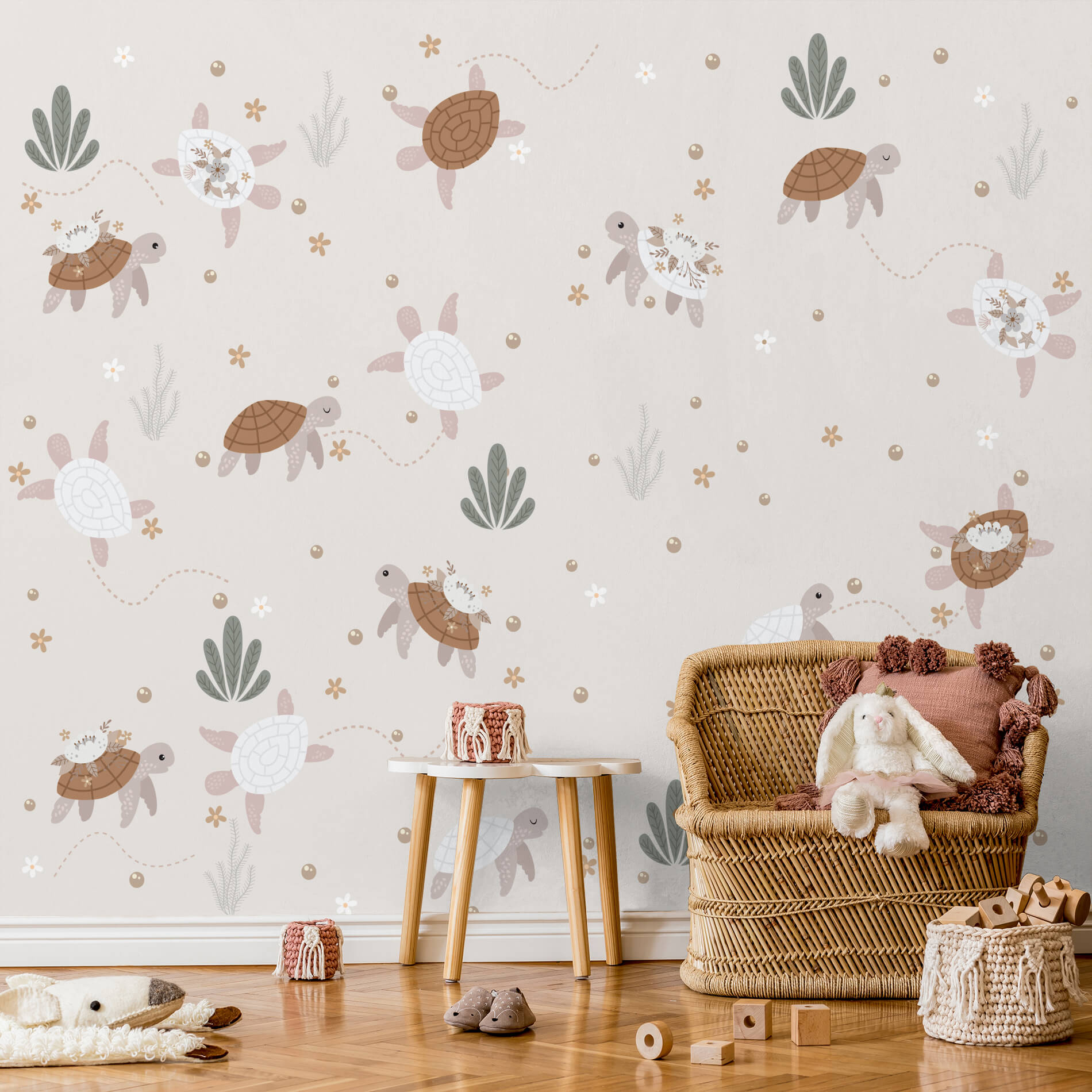 • Design lúdico com tema de tartarugas e flores, ideal para quartos infantis.