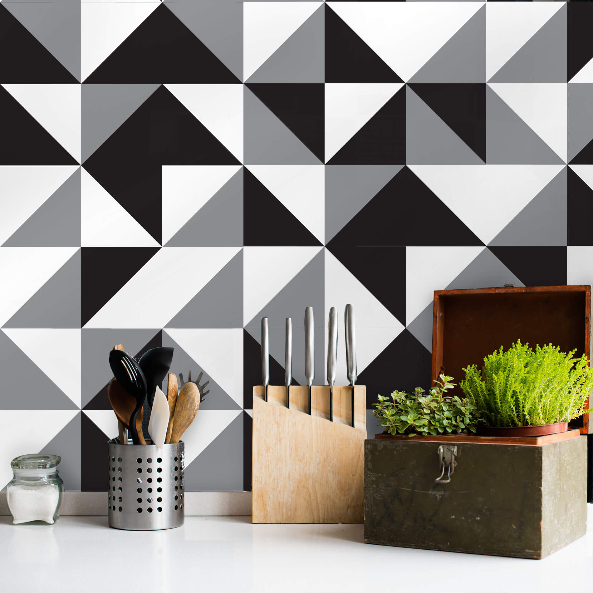 - Design geométrico moderno que valoriza a decoração da cozinha.