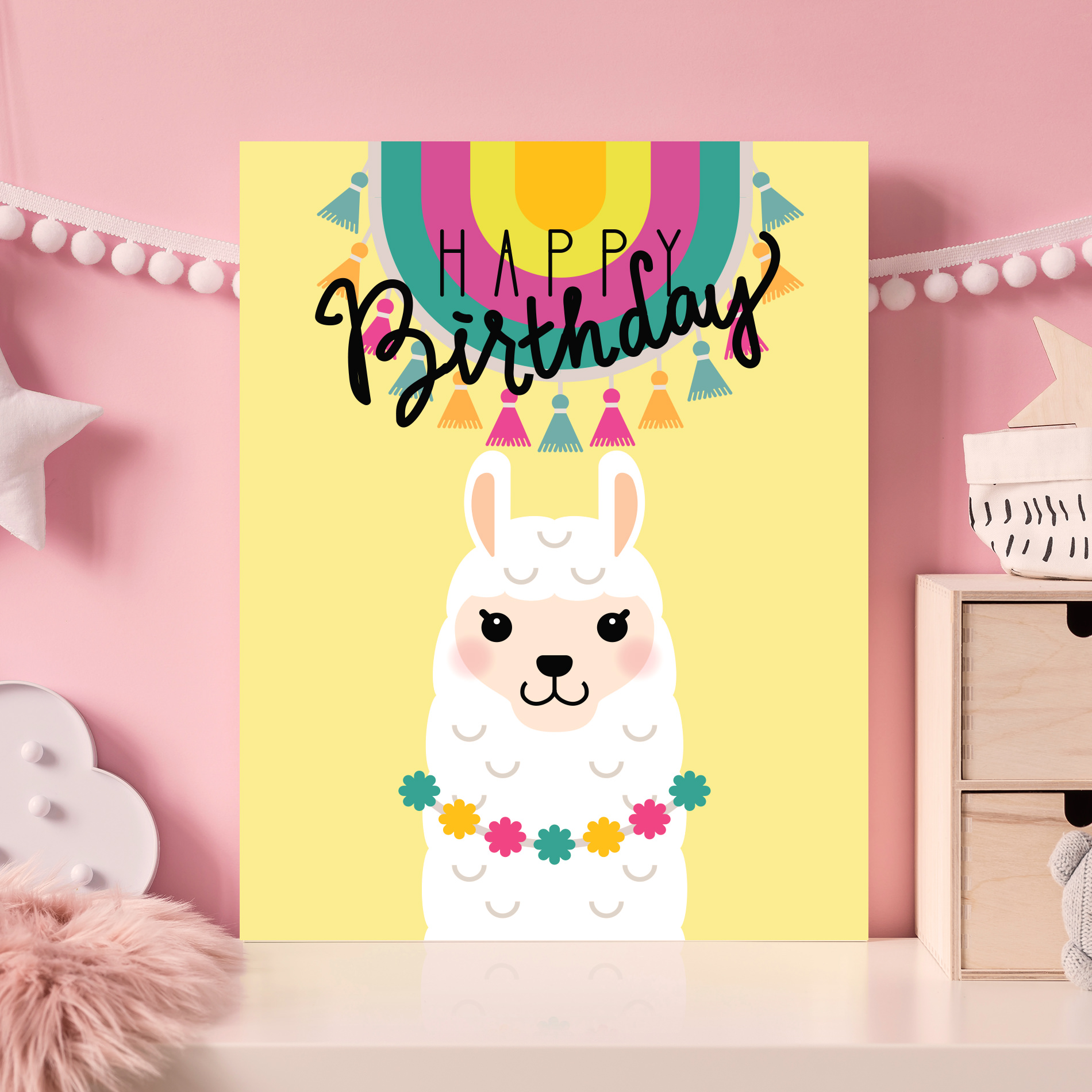 Placa Decorativa Lhama Happy Birthday Amarelo MDF 20x30cm