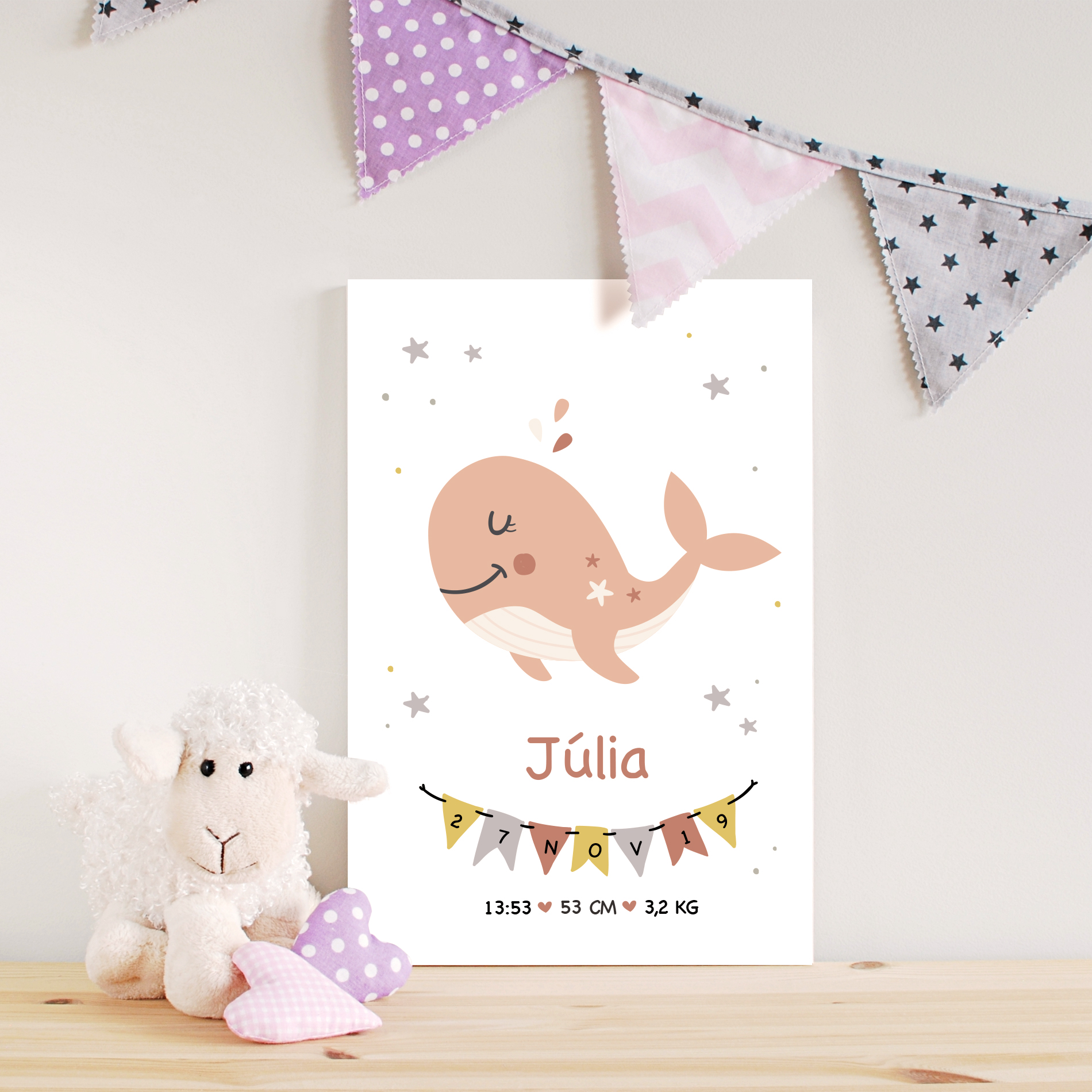 - Design personalizado que registra informações do nascimento, tornando o ambiente único e acolhedor.