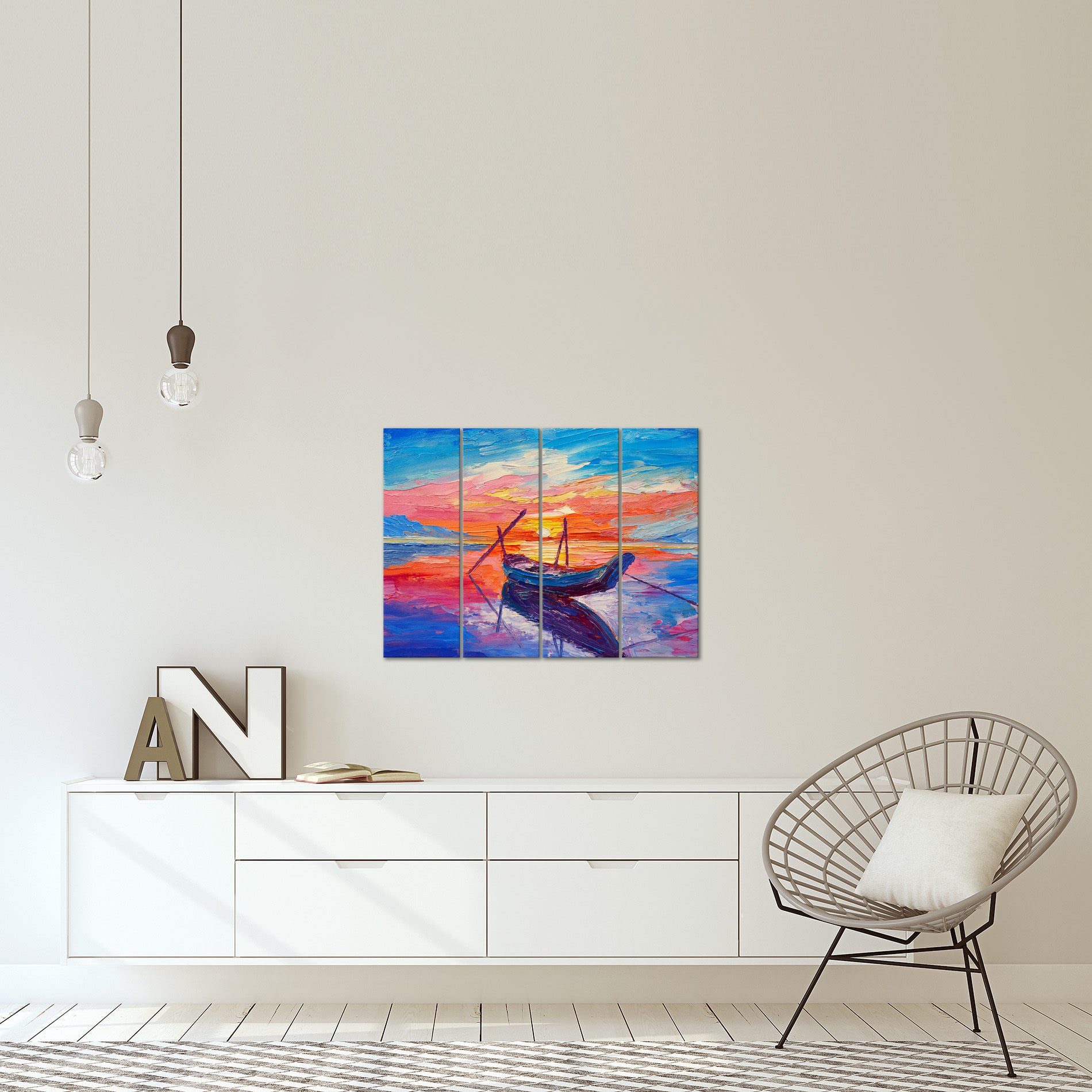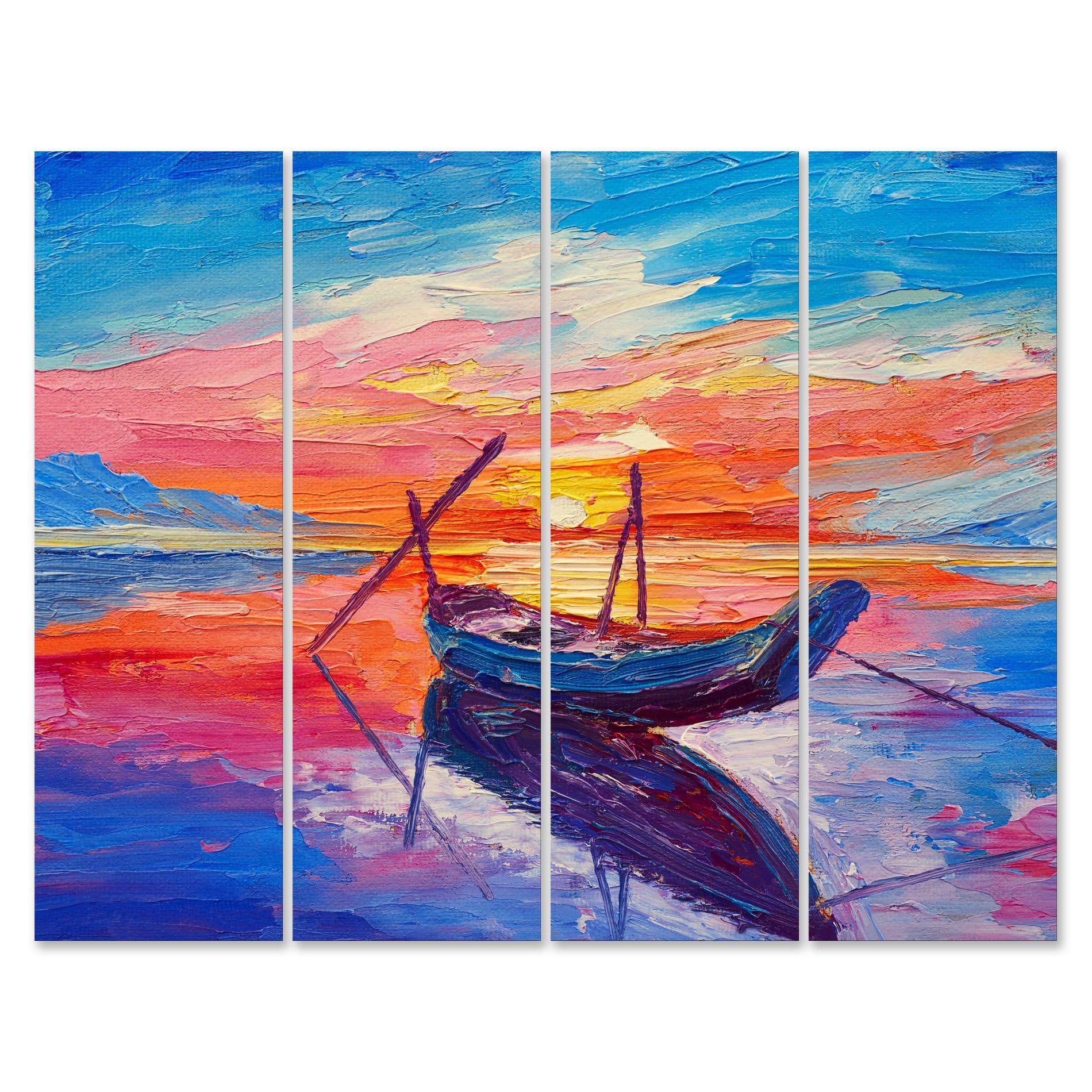 • Tipo de produto: Placa decorativa em MDF, composta por 4 placas que formam uma imagem única de um barco ao pôr do sol, trazendo elegância para sua decoração.