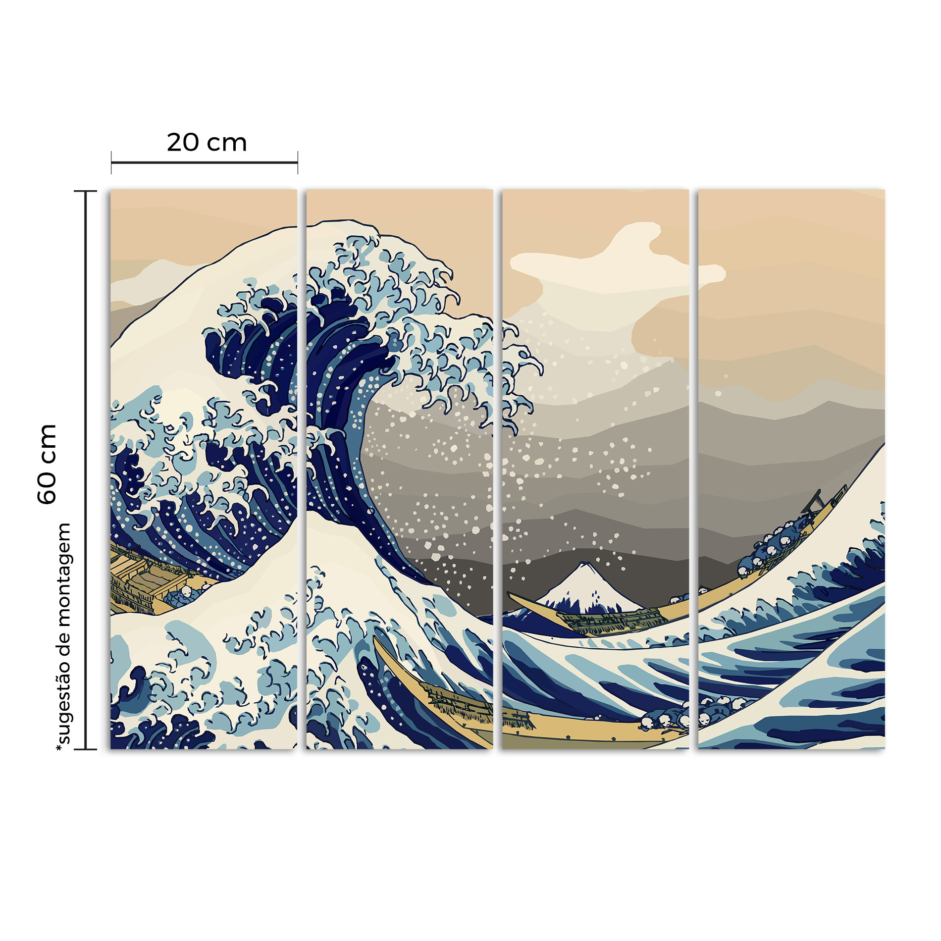4 quadros de 20x60cm, com 3mm de espessura. O quadro montado fica com 60cm de altura e 86cm de largura.