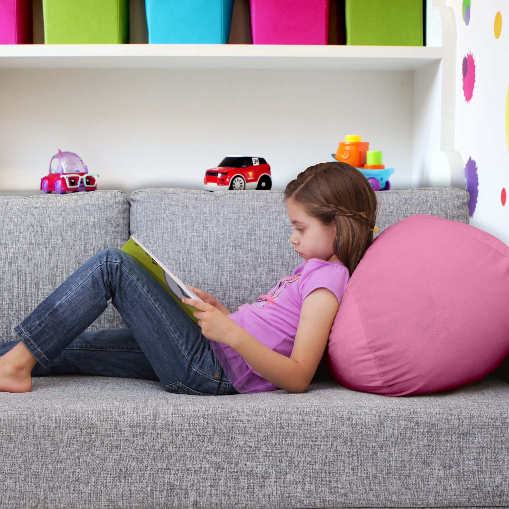 O fechamento é feito com zíper e quando o organizador está cheio vira um confortável puff, que serve de assento e almofadão. São várias cores alegres e vibrantes para decorar e deixar o quarto arrumadinho.