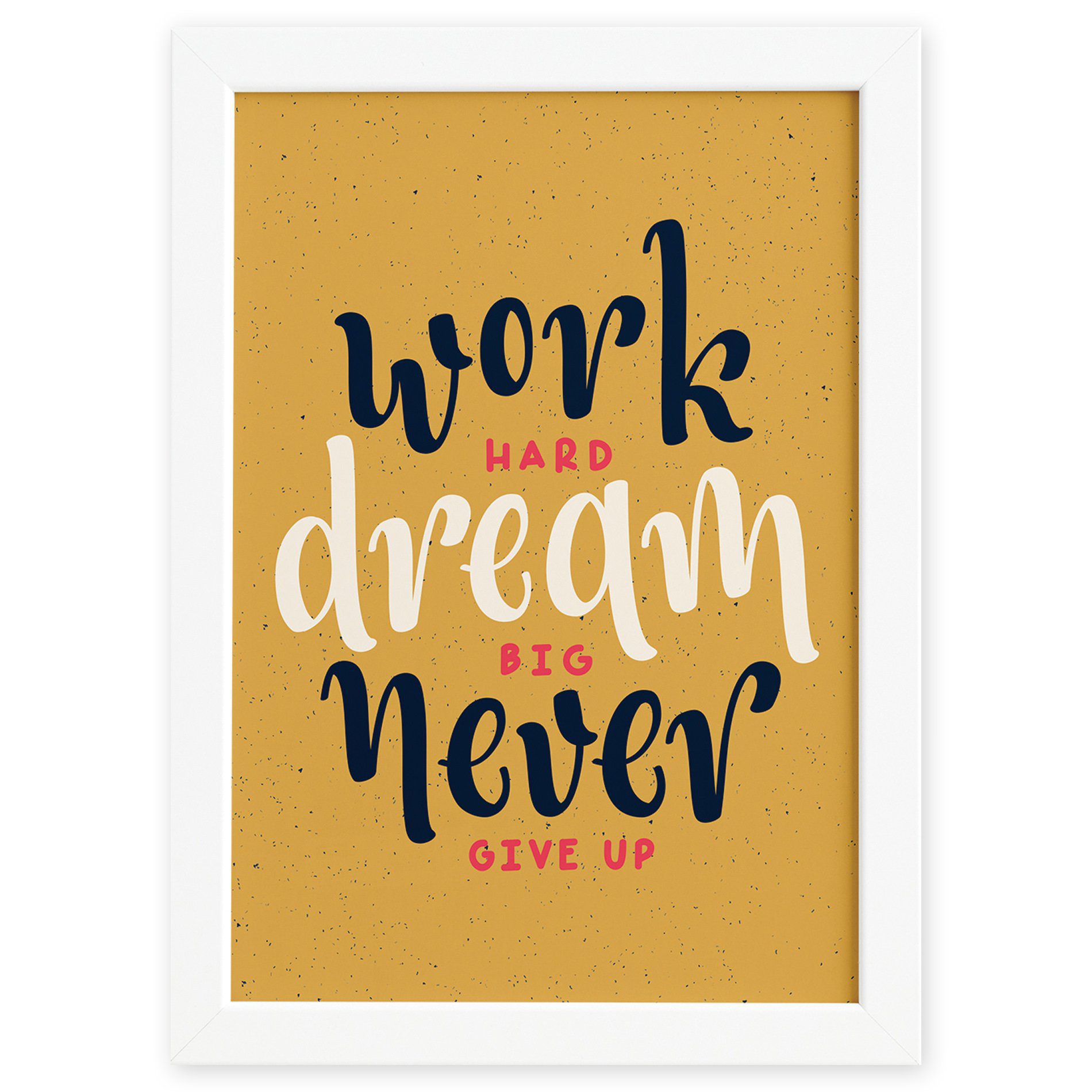 • Design inspirador: Texto motivacional “work hard dream big never give up” em fundo amarelo mostarda, trazendo alegria e motivação ao seu espaço.
