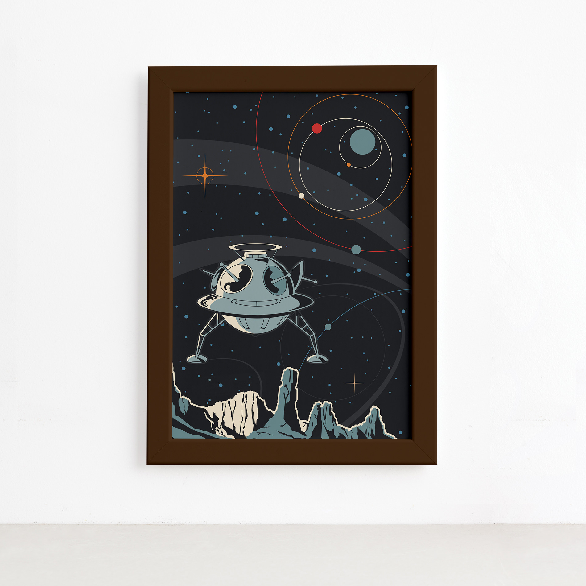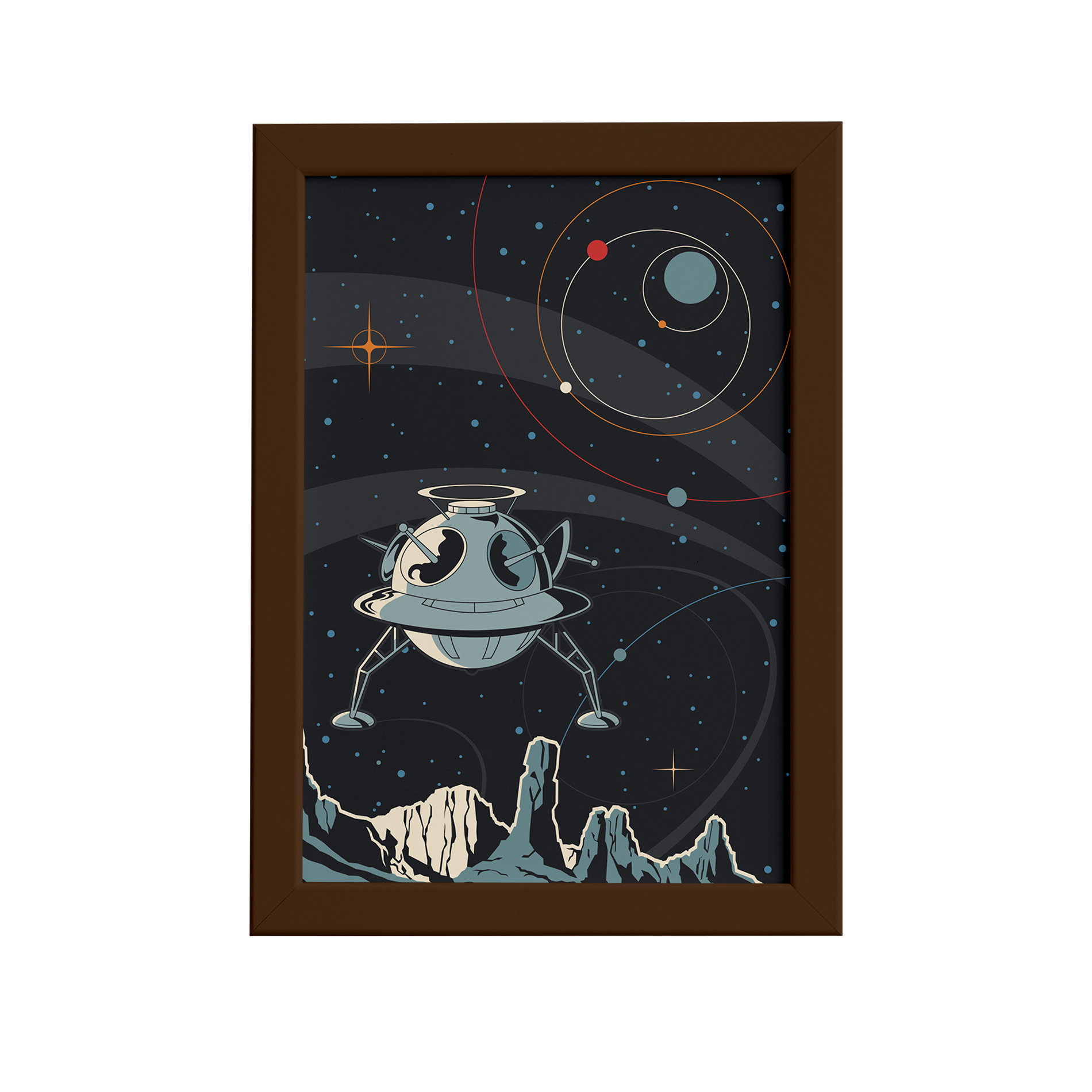 Quadro Espaço Retrô Foguete Esférico Mold Marrom 33x43cm