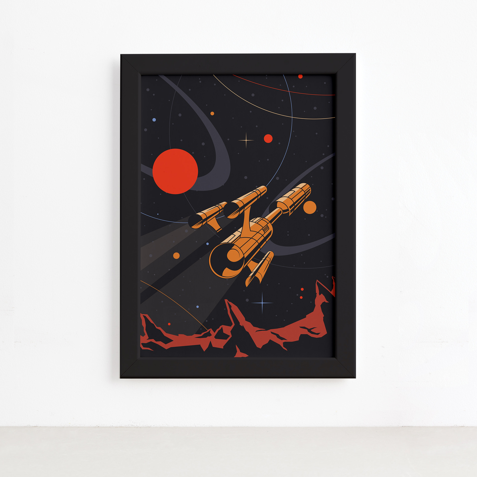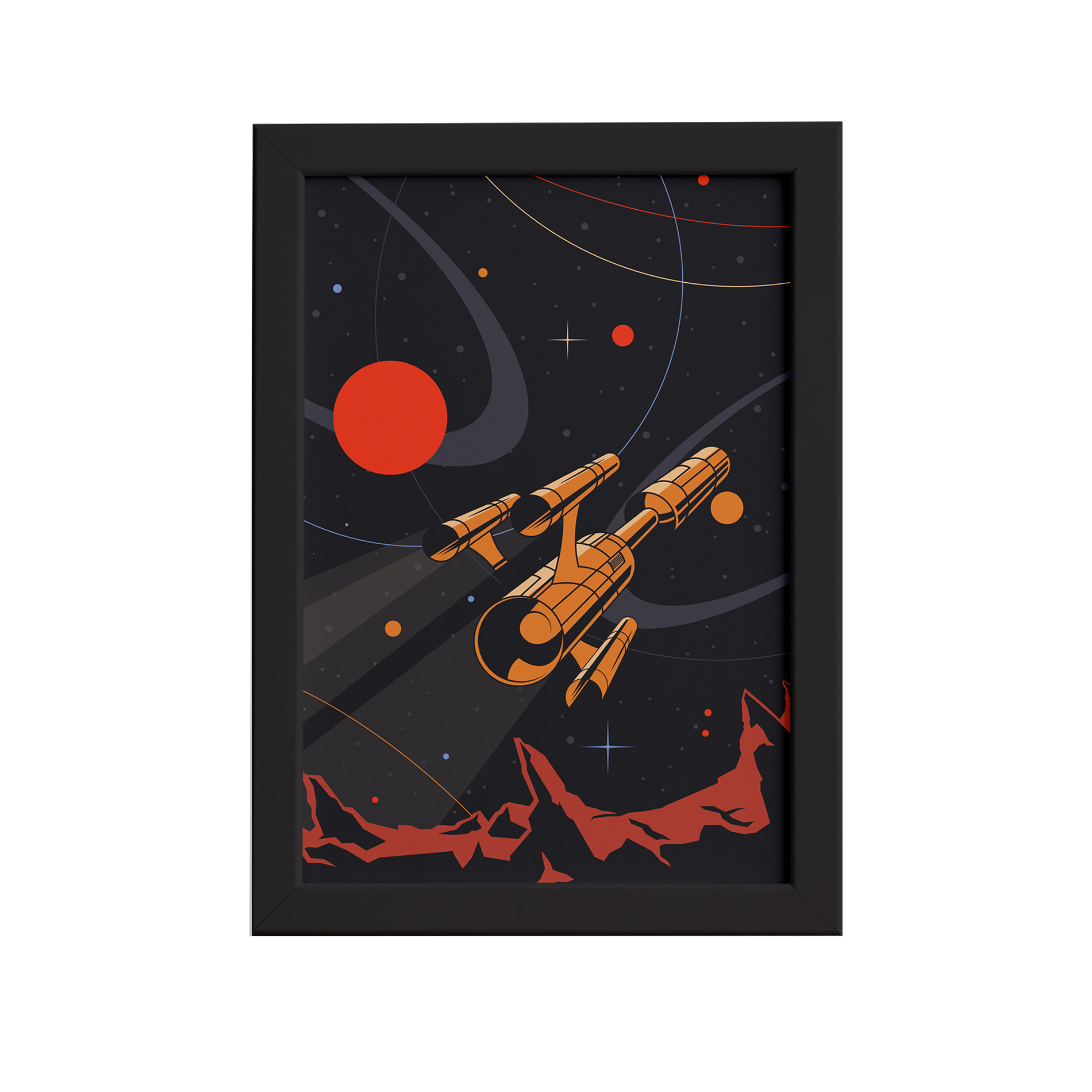 Quadro Espaço Retrô Nave Laranja Moldura Preta 22×32 cm