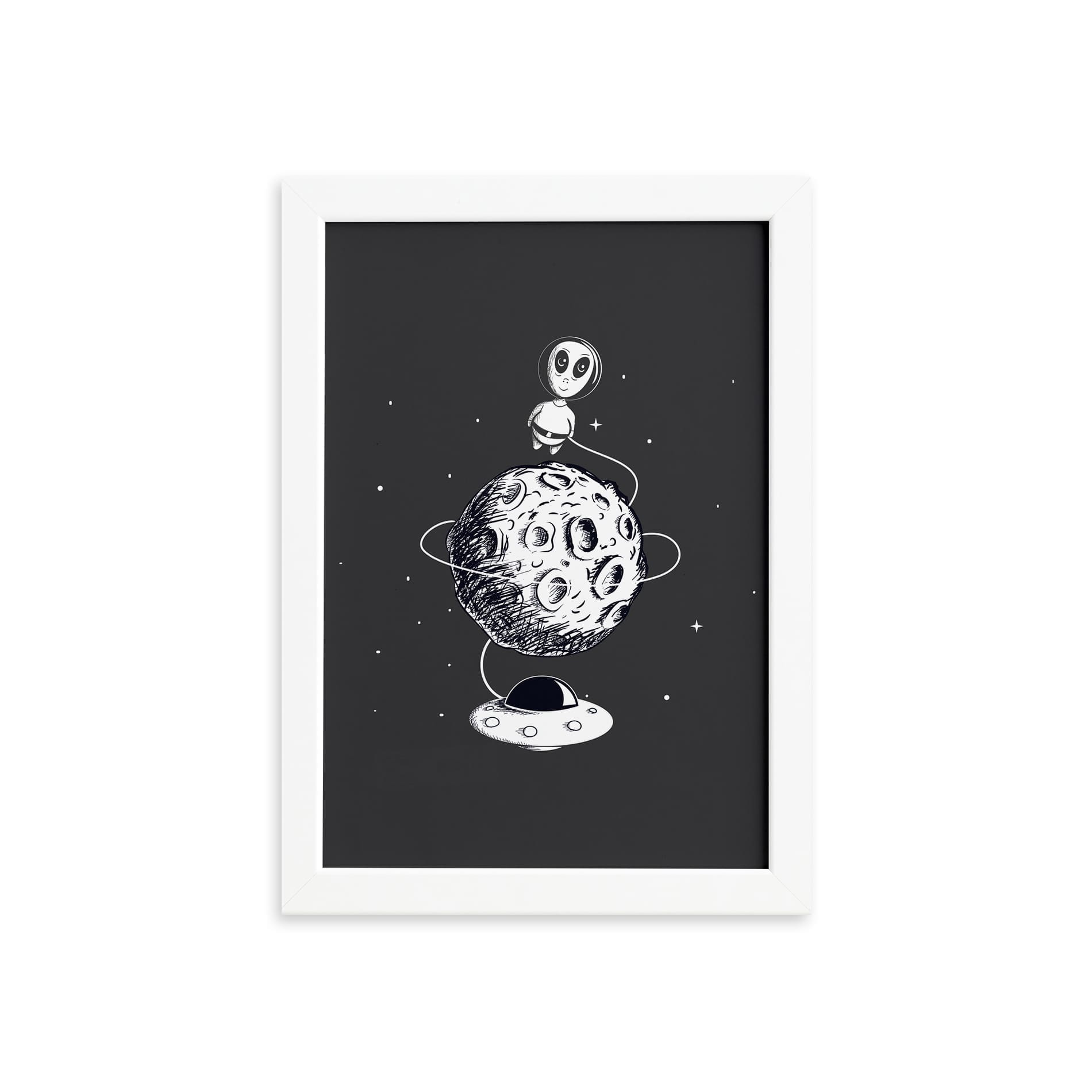 Quadro Espaço Sideral Alienígena na Lua Moldura Branca 33×43