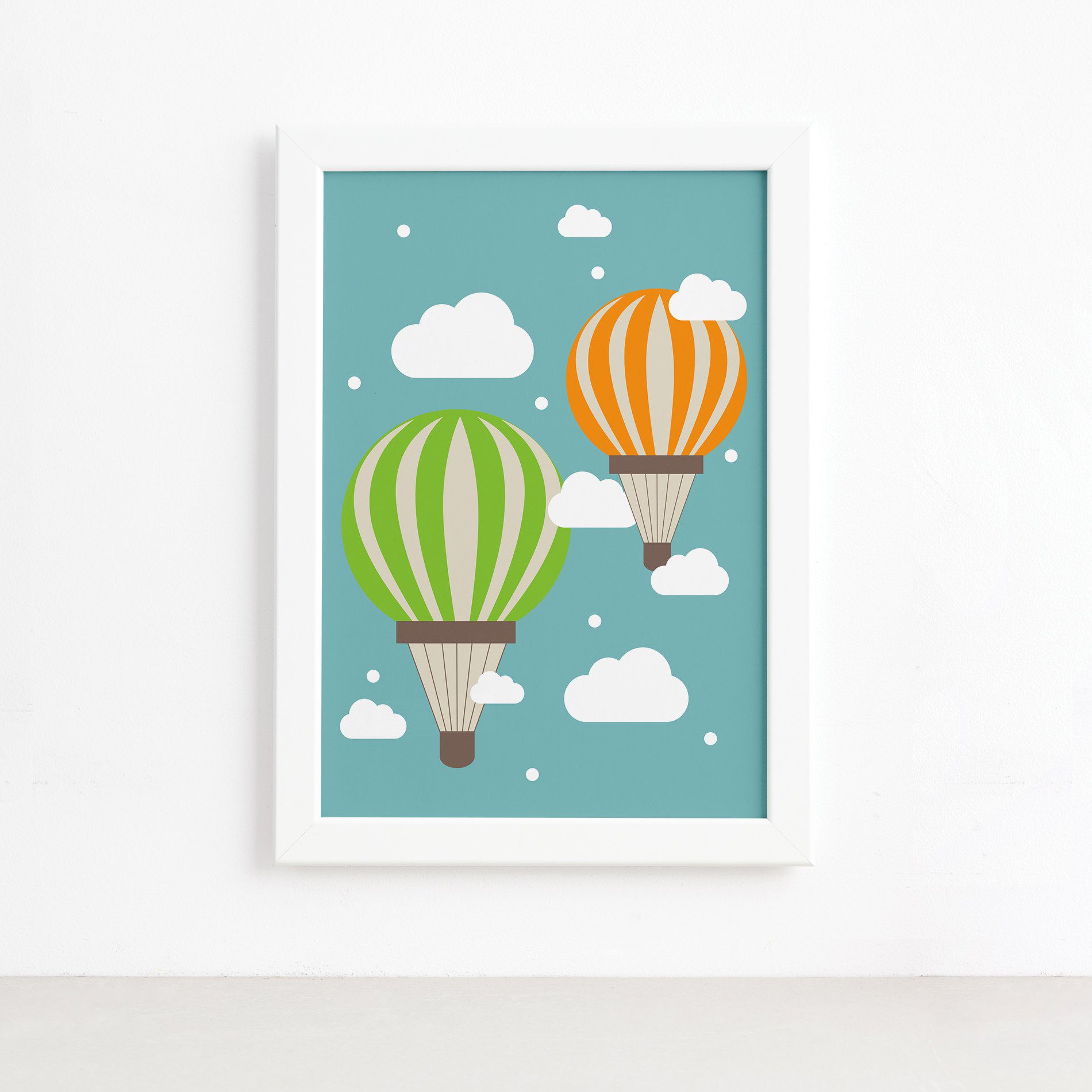 Quadro infantil com moldura branca mostrando balões coloridos, ideal para decoração de quarto de bebê.