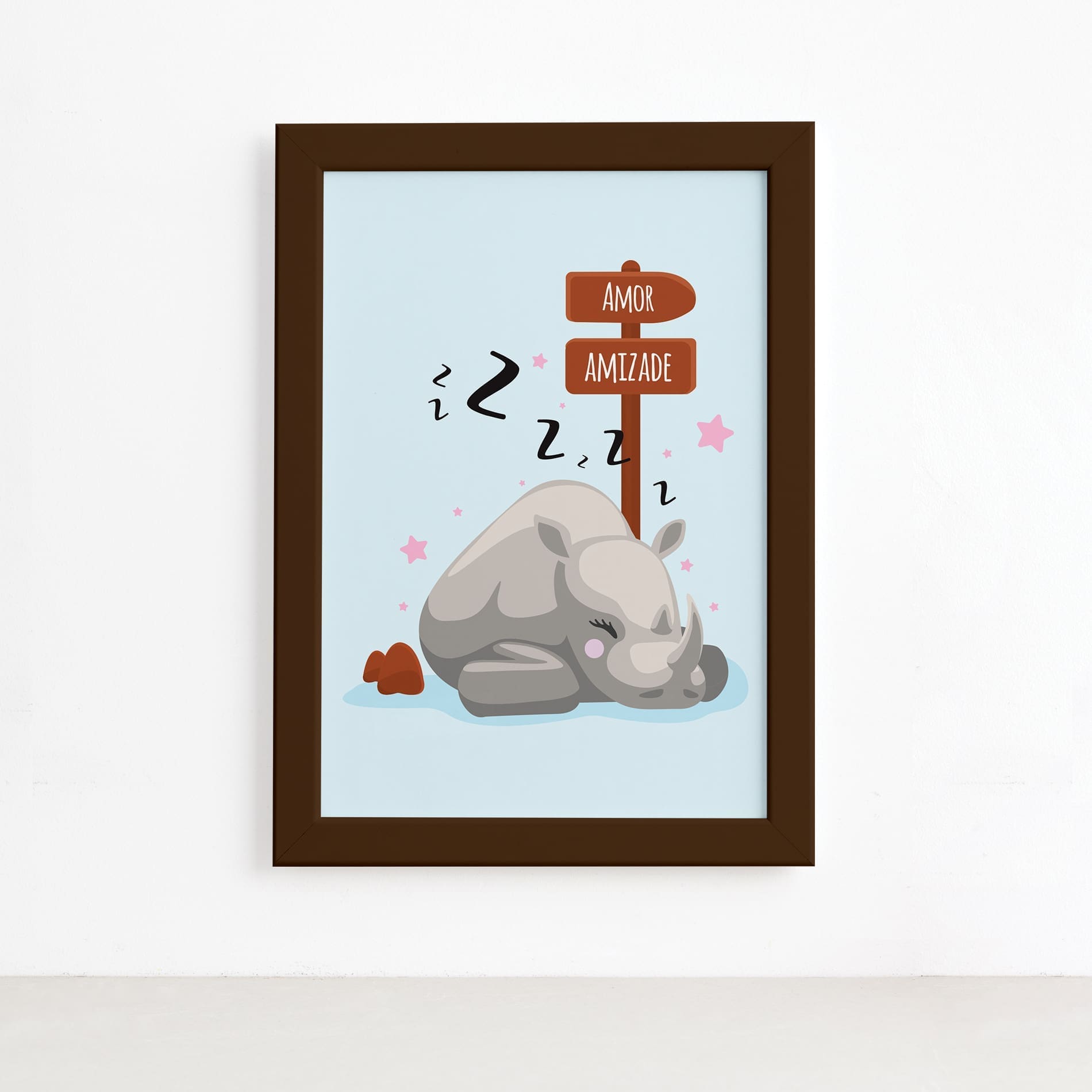 Quadro Infantil Rinoceronte Amor Moldura Marrom 22x32cm