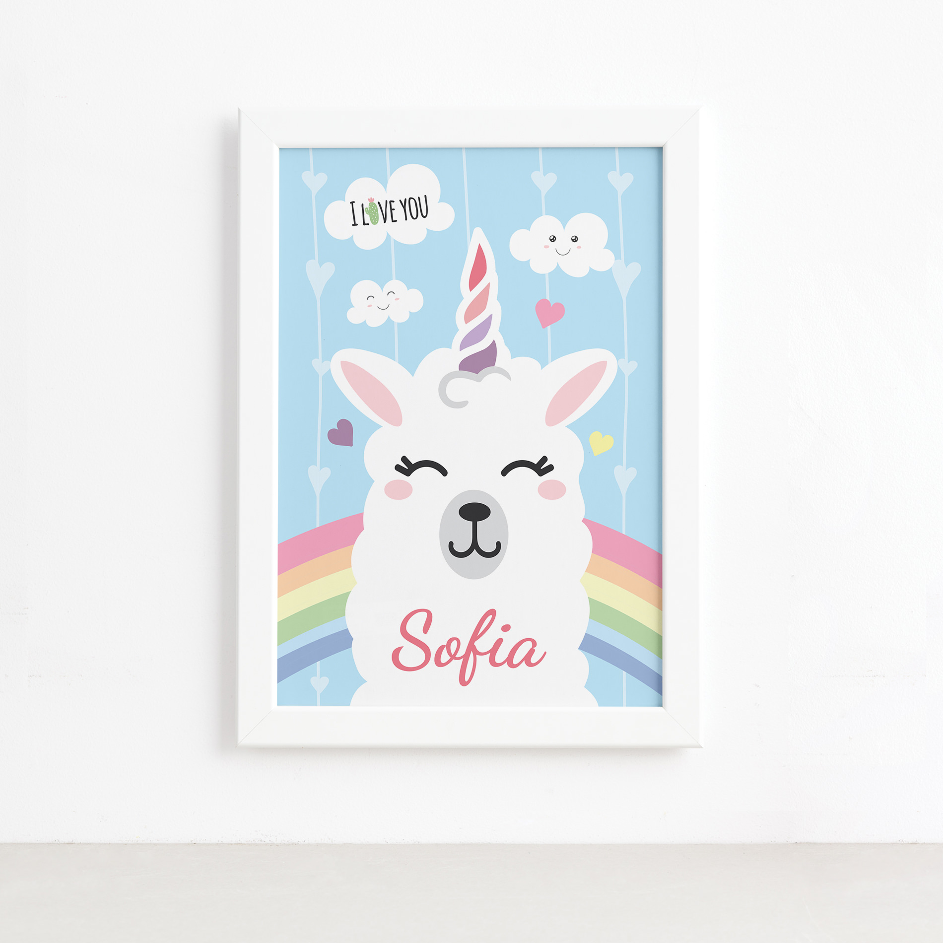 Quadro Nome Personalizado Lhama Unicórnio Branca 22x32cm