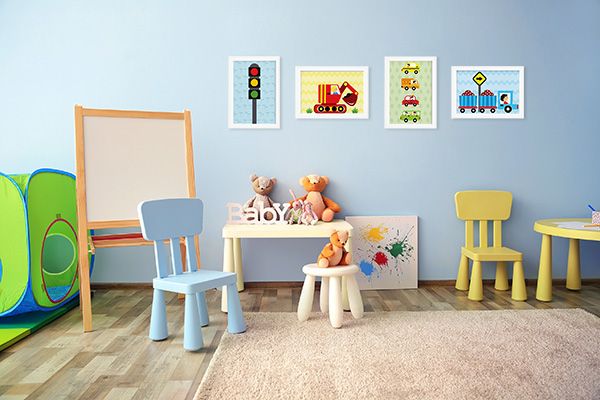 Selecione uma parede lisa e limpa no quarto infantil para garantir a melhor fixação e destaque dos quadros.