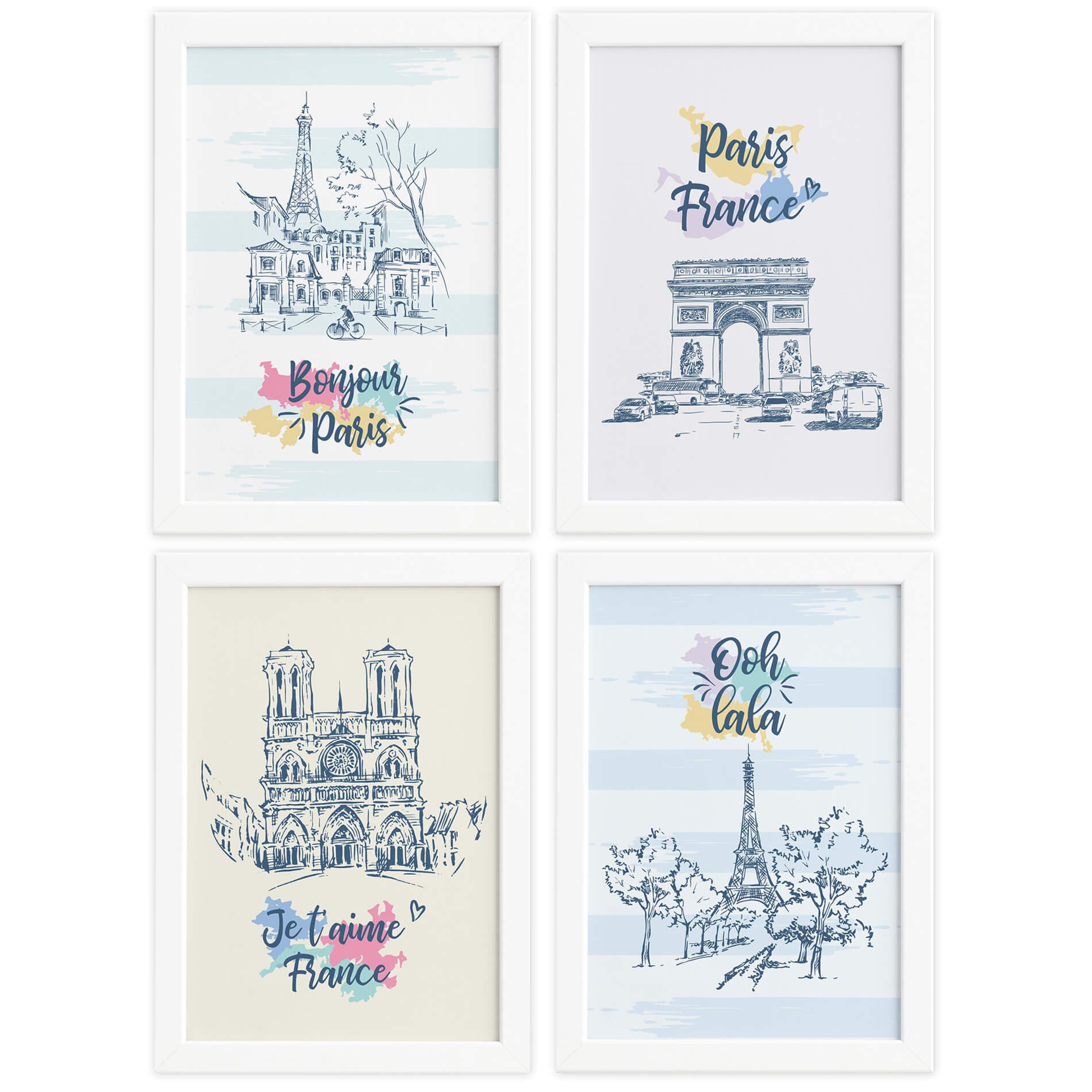 Quadros Paris Ilustrada Sala Moldura Branca 33x43cm Kit 4un