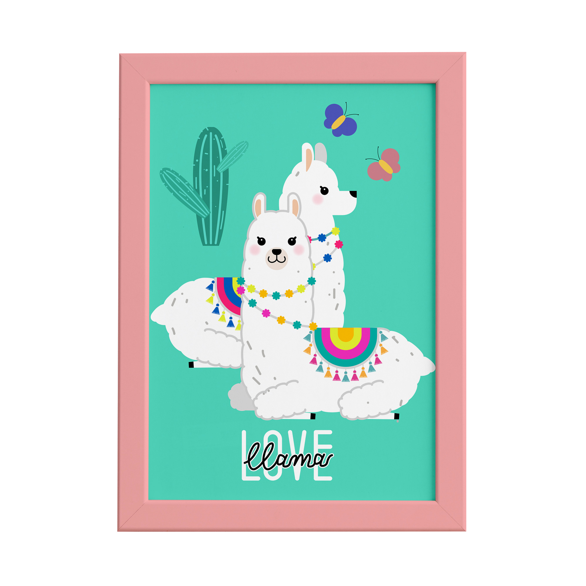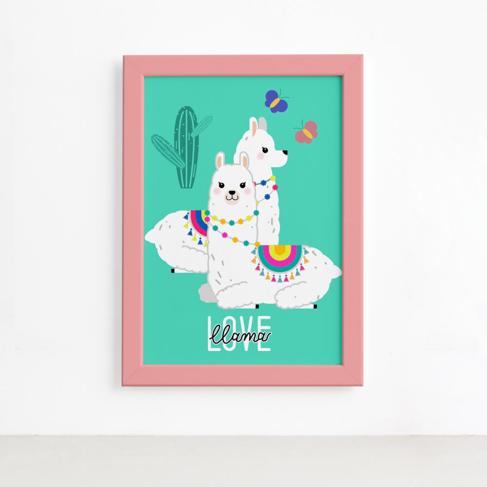 Quadro Decorativo Lhama Love Ciano 22x32cm Mold. Rosa
