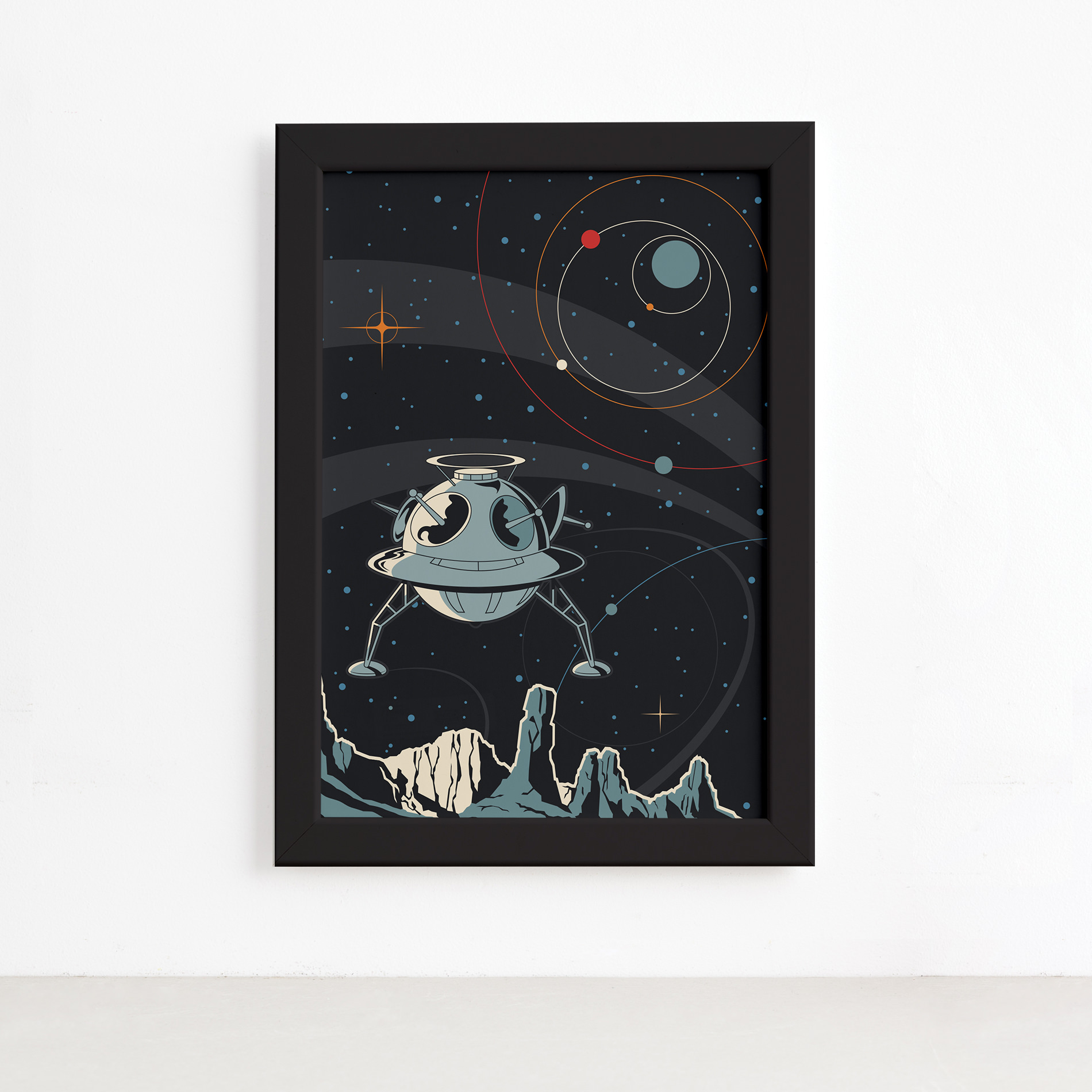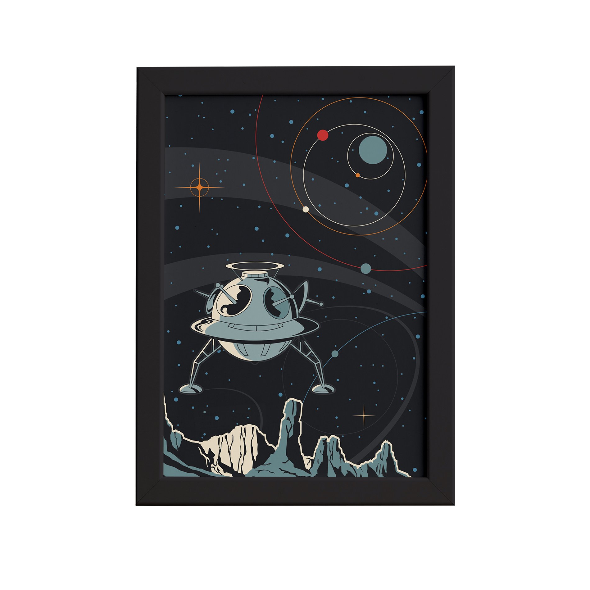 Quadro Espaço Retrô Foguete Esférico Mold Preta 33x43cm