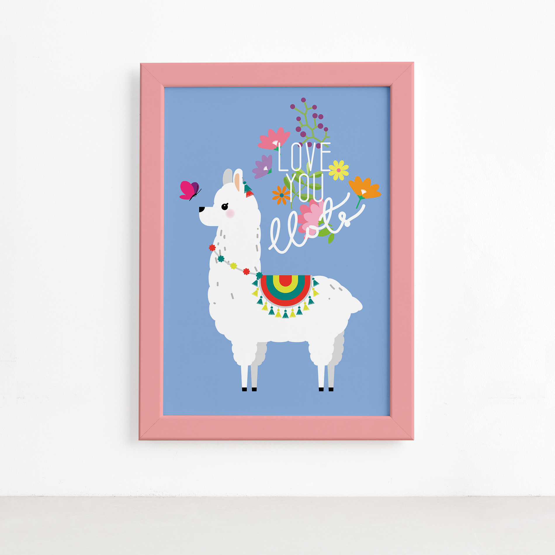 Quadro Infantil Lhama Love You Lots Azul 22x32cm Mold. Rosa