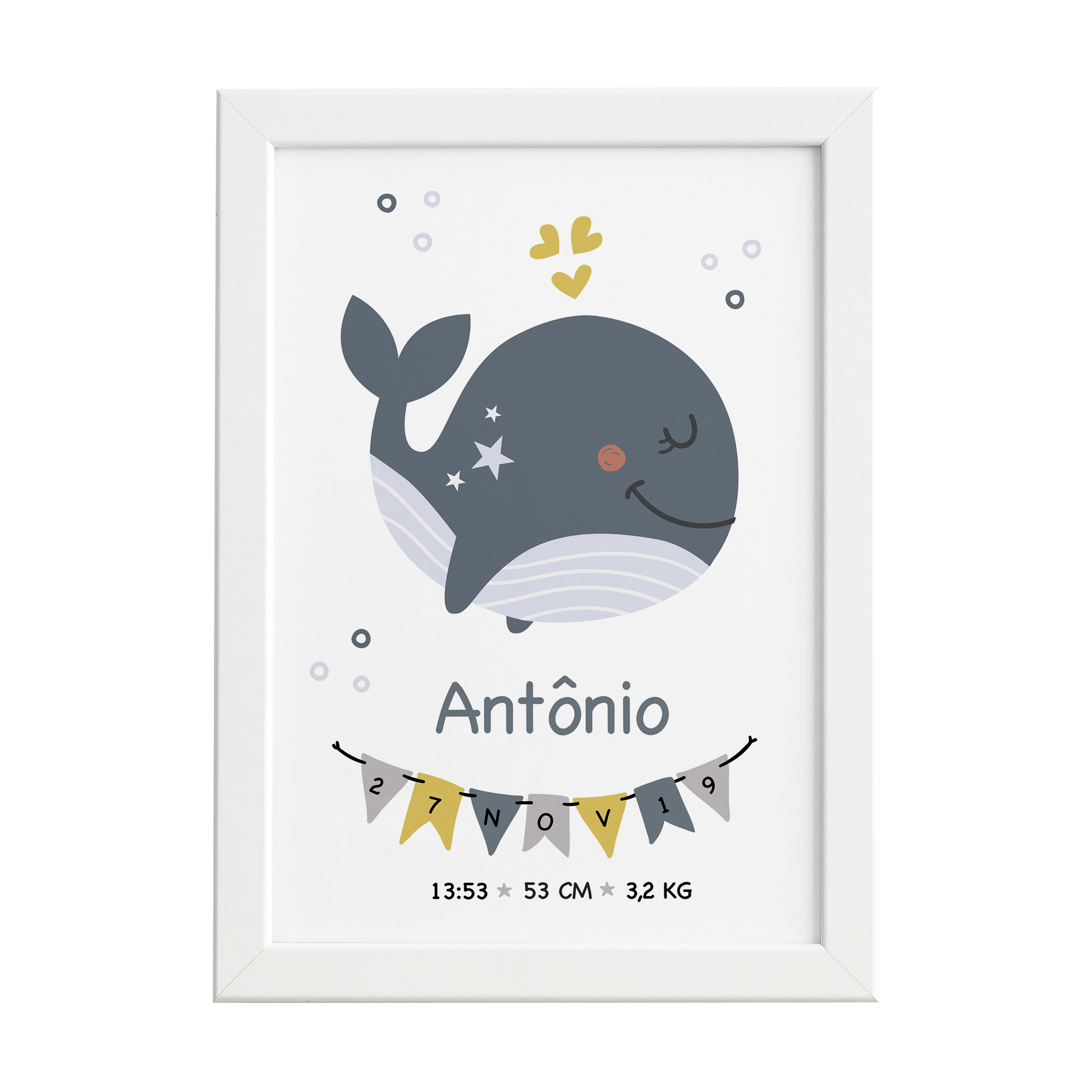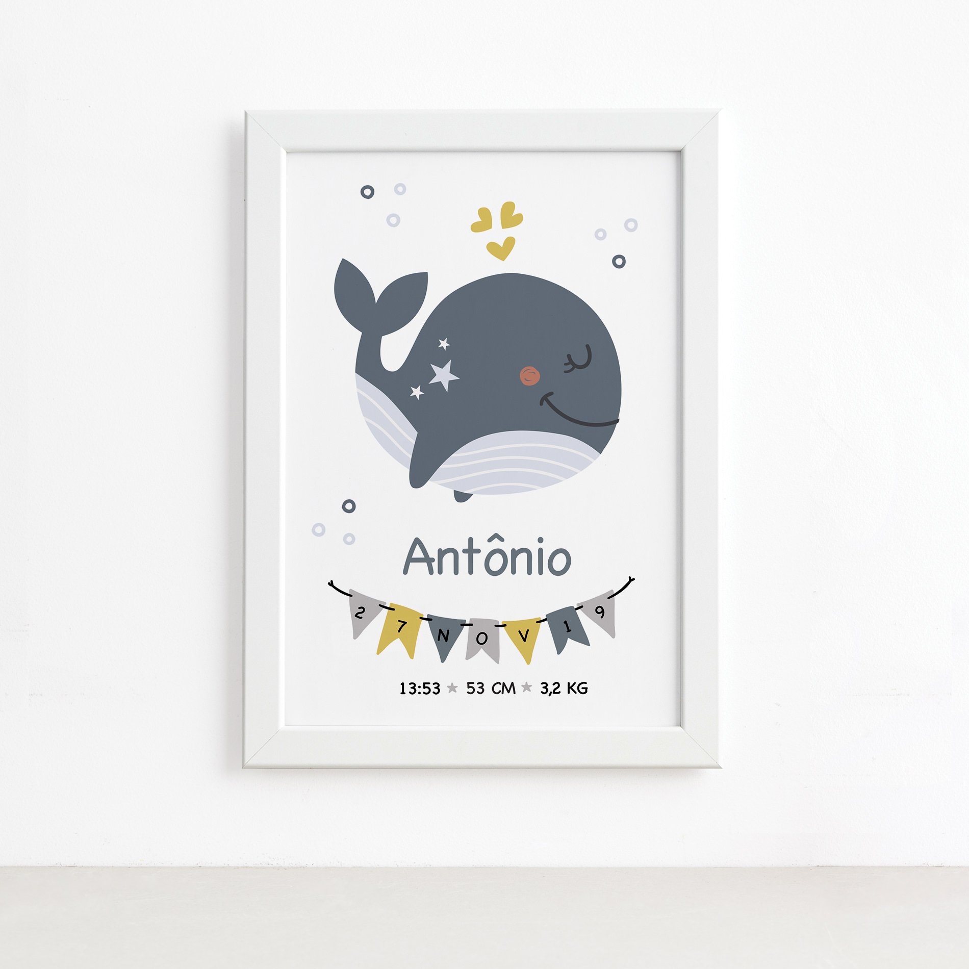 Quadro Nascimento Baleia Menino Moldura Branca 33x43cm
